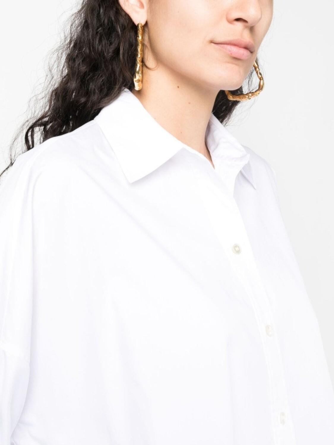 Поплин, боковые разрезы, рукава с манжетами на пуговицах, классический воротник и неравномерный подол.