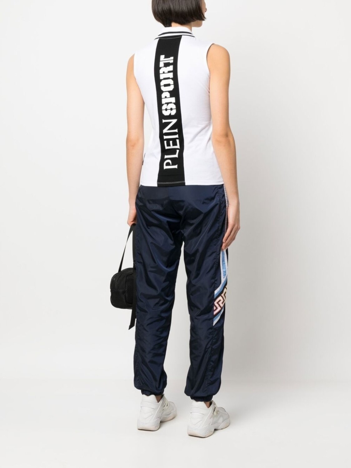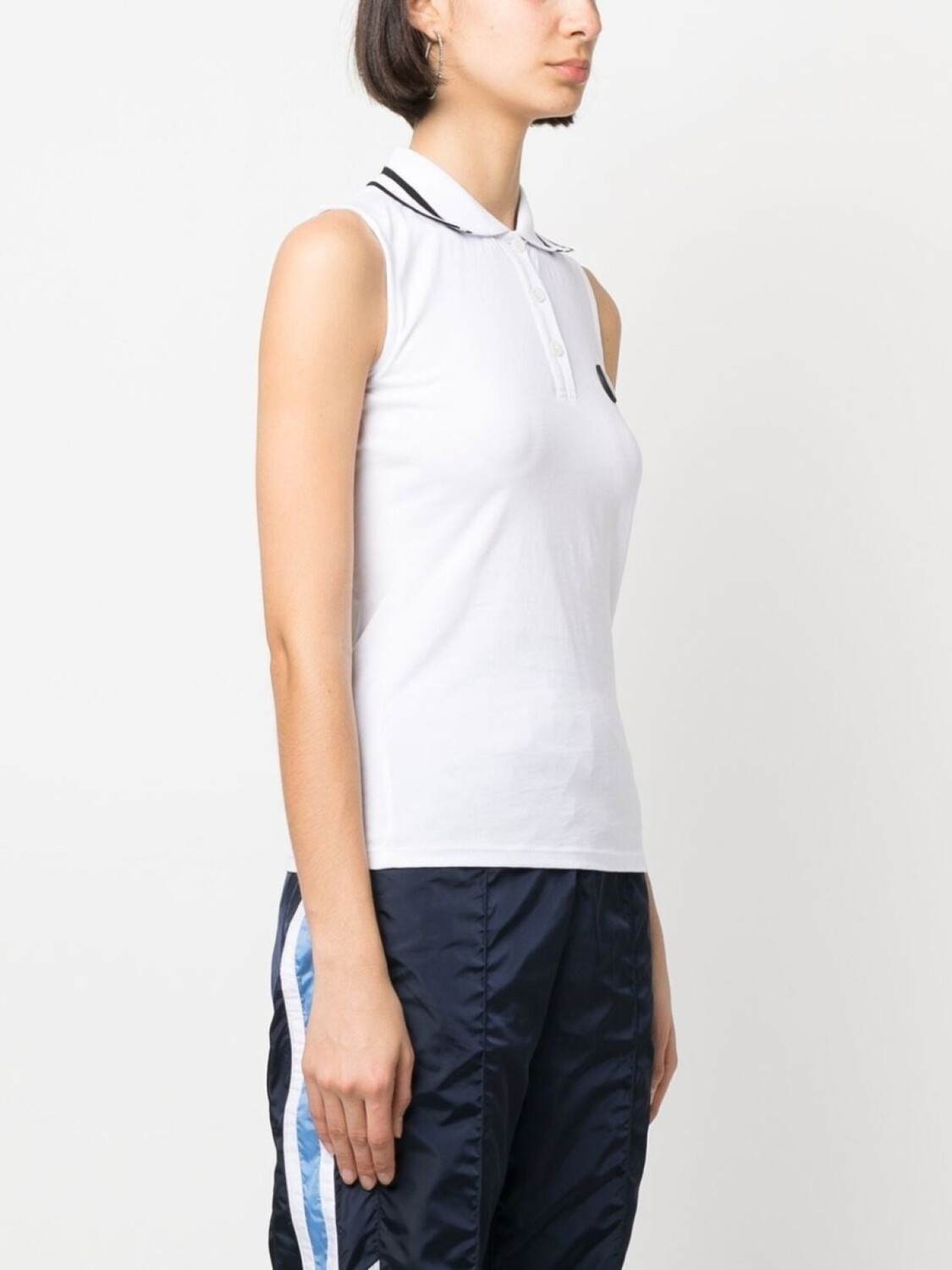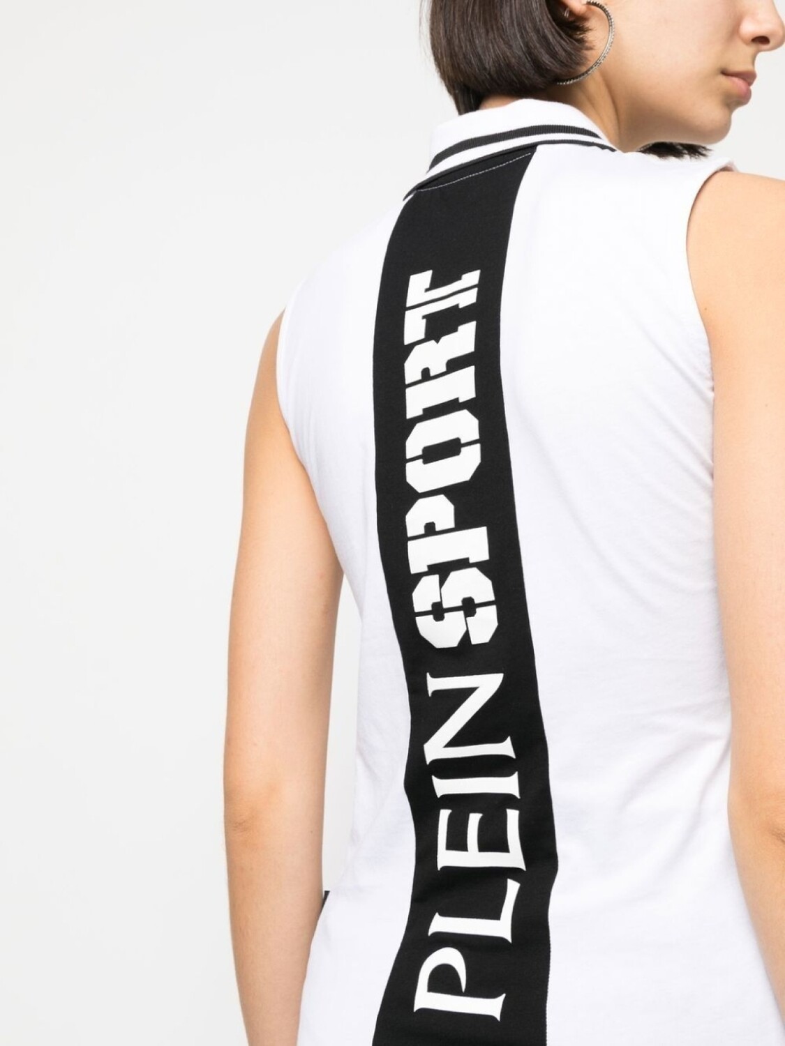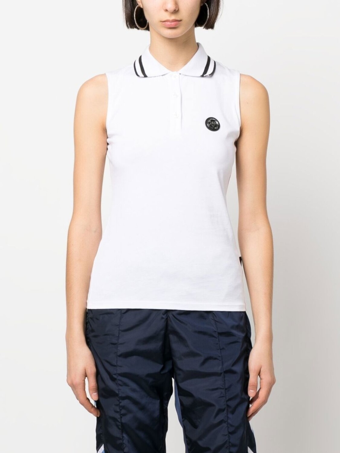 Белый/черный, воротник поло, принт с логотипом сзади, металлический логотип, воротник с вышитым логотипом, планка на пуговицах спереди, круглый вырез и без рукавов.