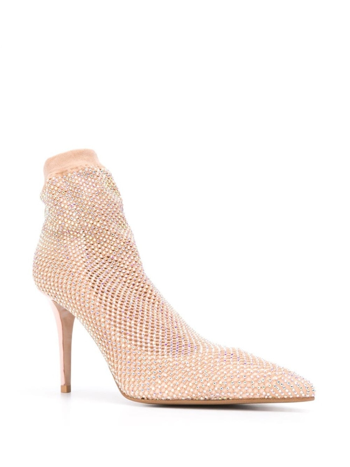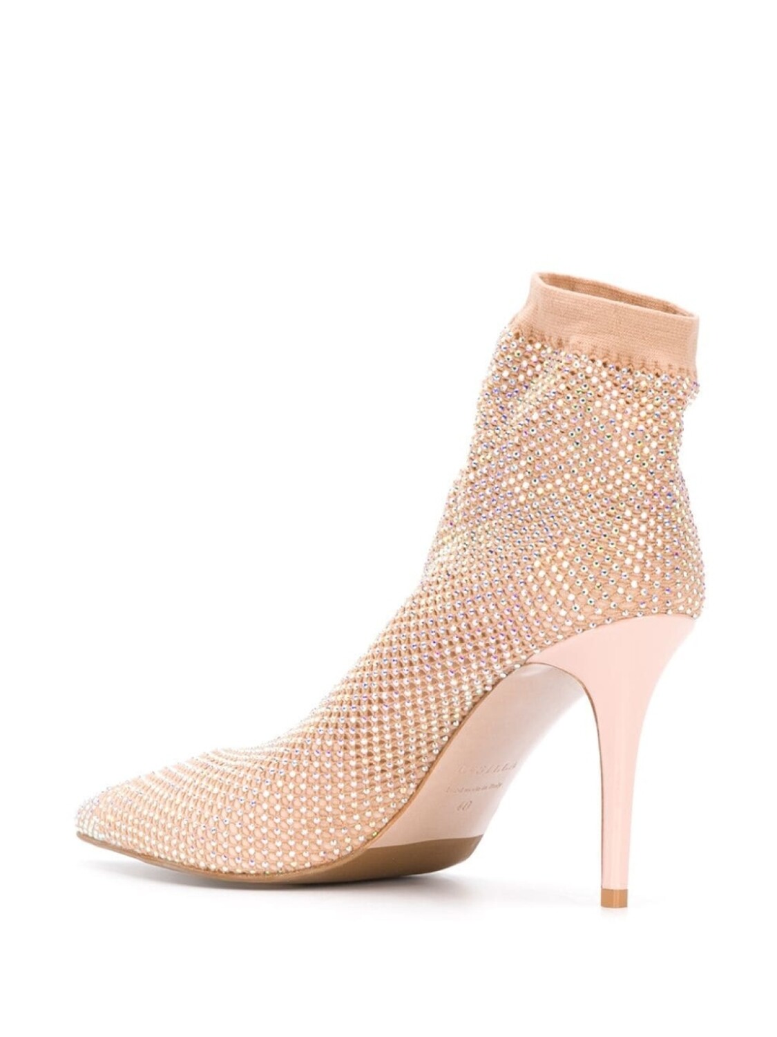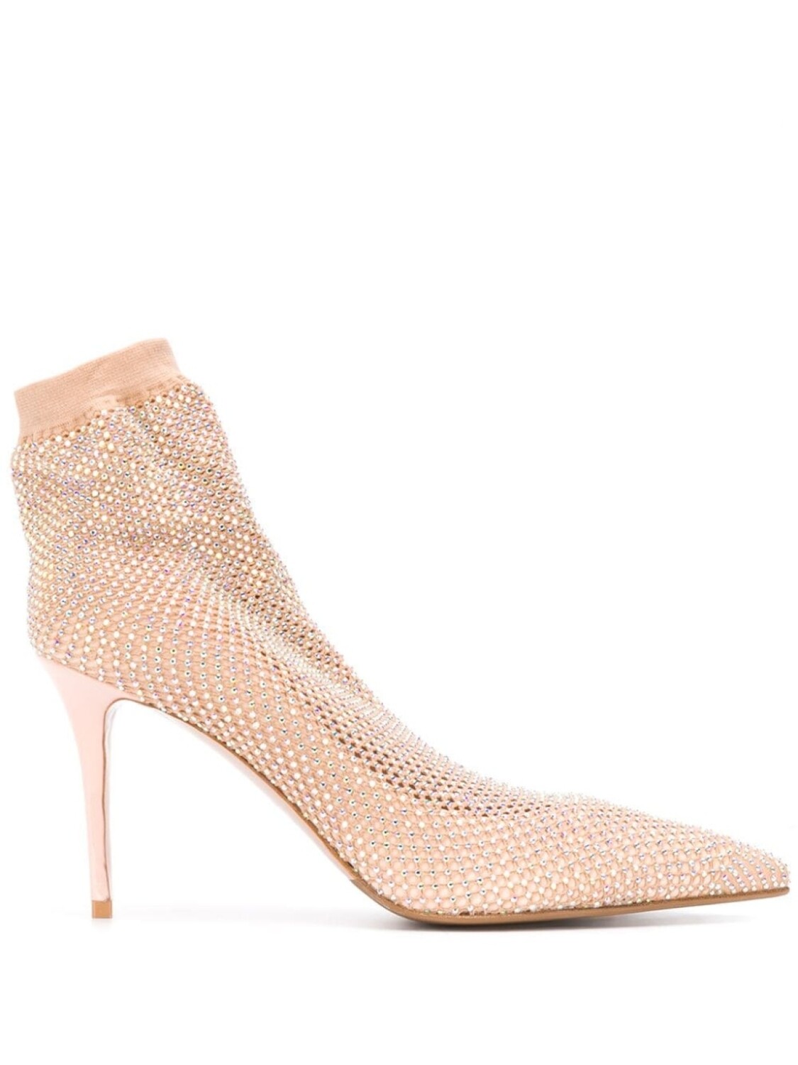 Декор из кристаллов, сетка, без застежки и высокий каблук.