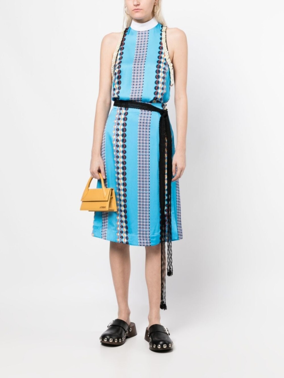 Синий, сатиновая фактура, сплошной графичный принт, воротник-стойка, без рукавов, пайетки и прямой подол.