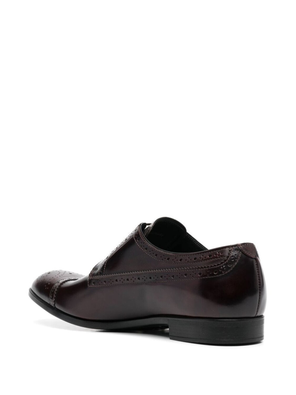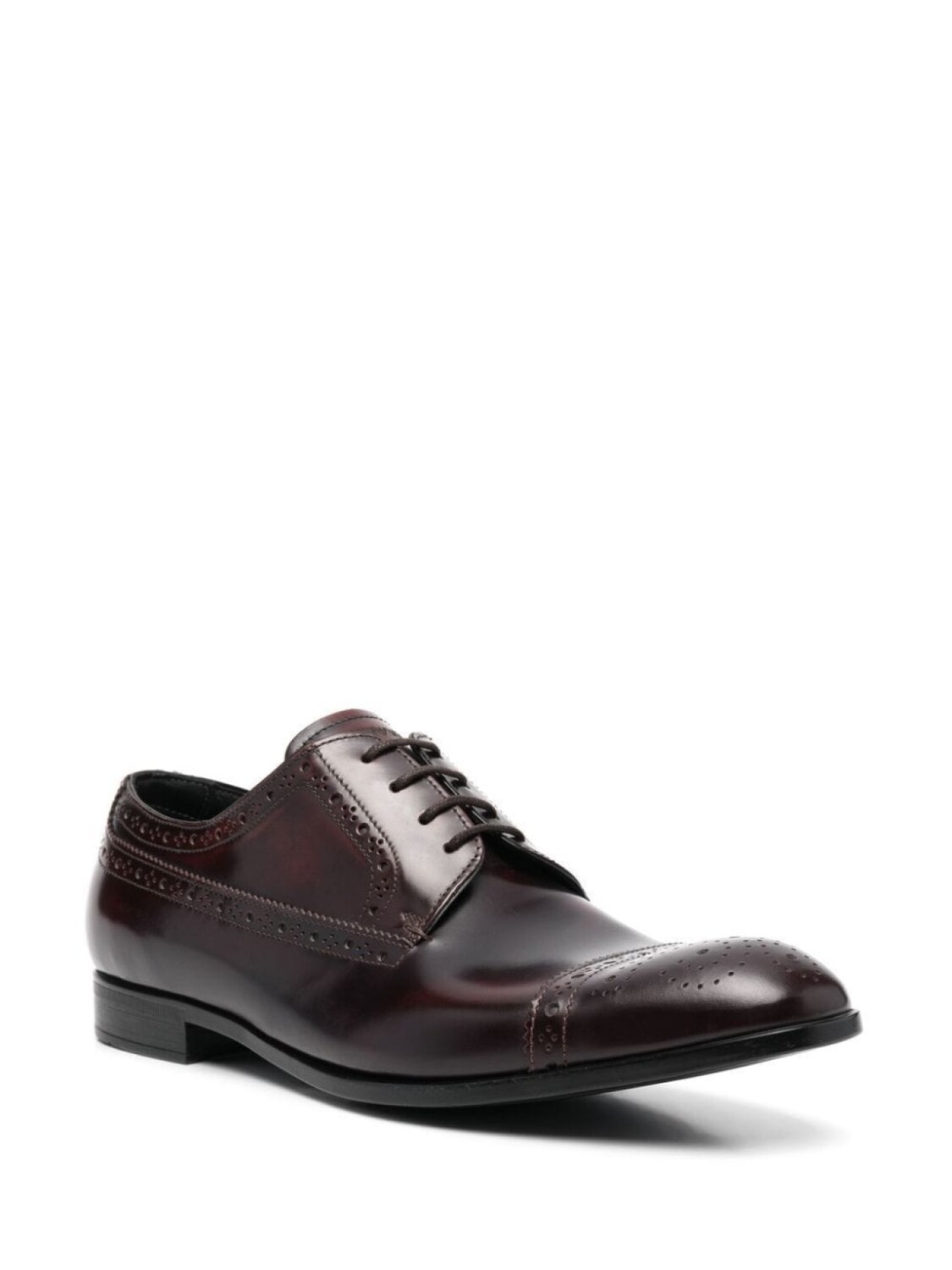 Бордовый, кожа, глянцевая фактура, перфорация, строчка в тон, язычок с логотипом, шнуровка спереди, кожаная стелька с логотипом, миндалевидный носок и низкий блочный каблук.