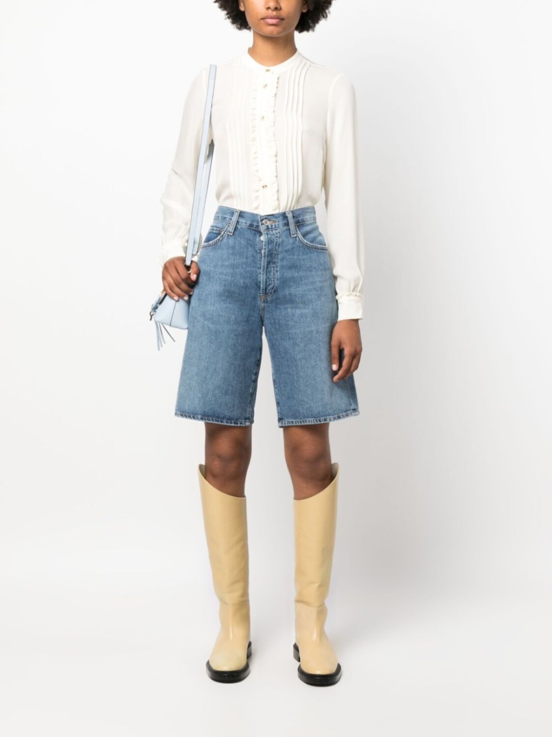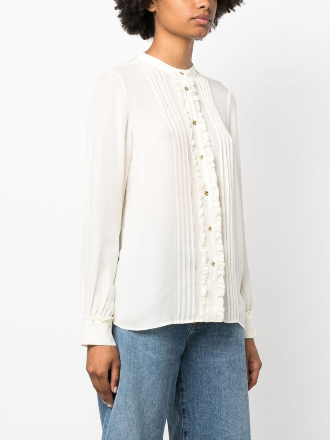 Кремово-белый, смесовый шелк, отделка с оборками, складки, без воротника, застежка на пуговицах спереди, длинные рукава и закругленный подол.