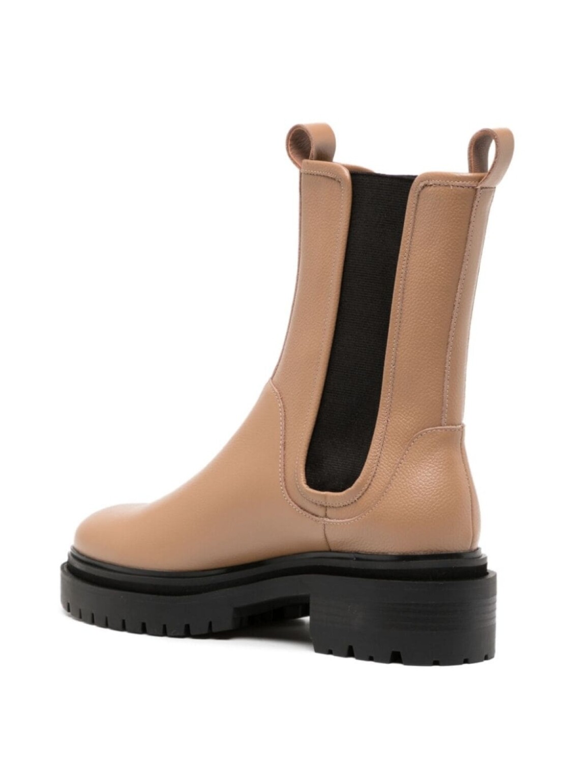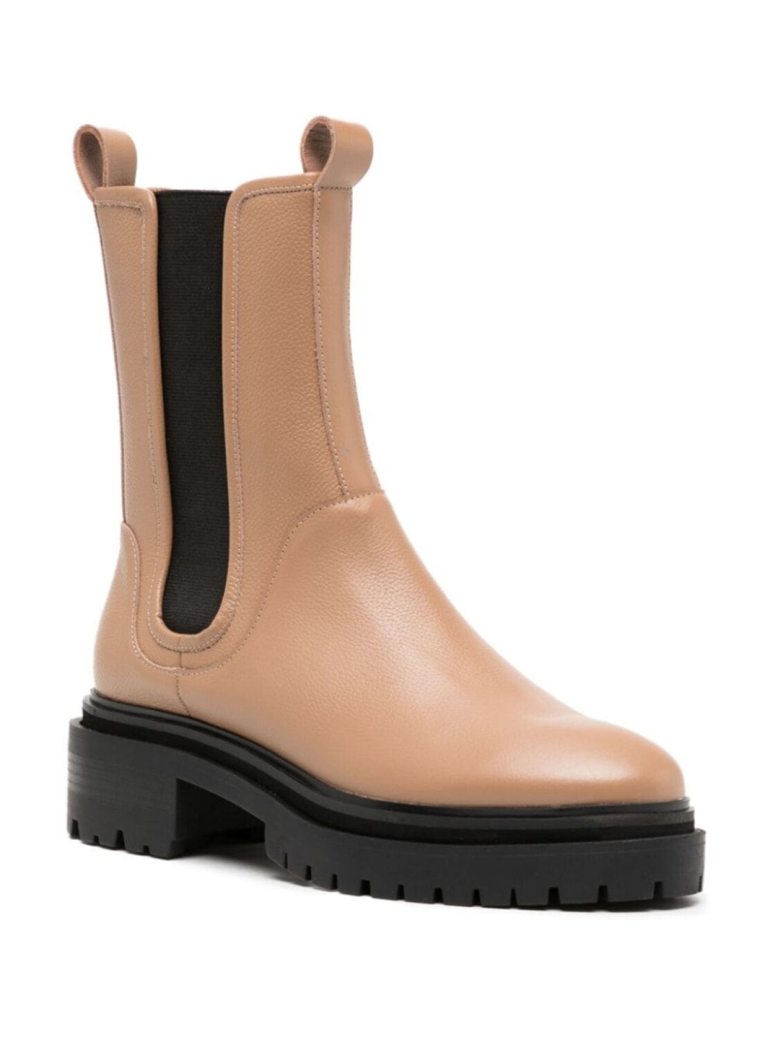 Телячья кожа, зернистая текстура, строчка в тон, эластичные боковые вставки, двойная петля для подтягивания, закругленный носок, модель без застежки, стелька с логотипом, блочный каблук и массивная резиновая подошва.