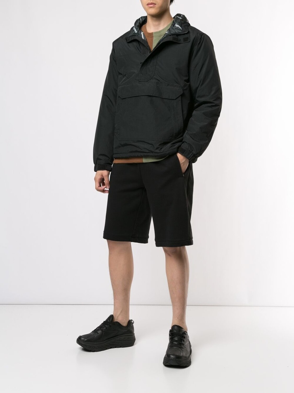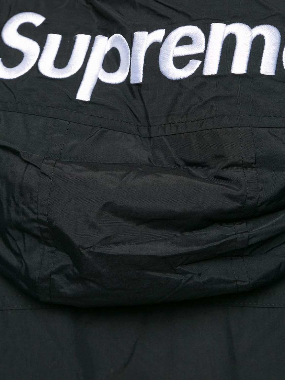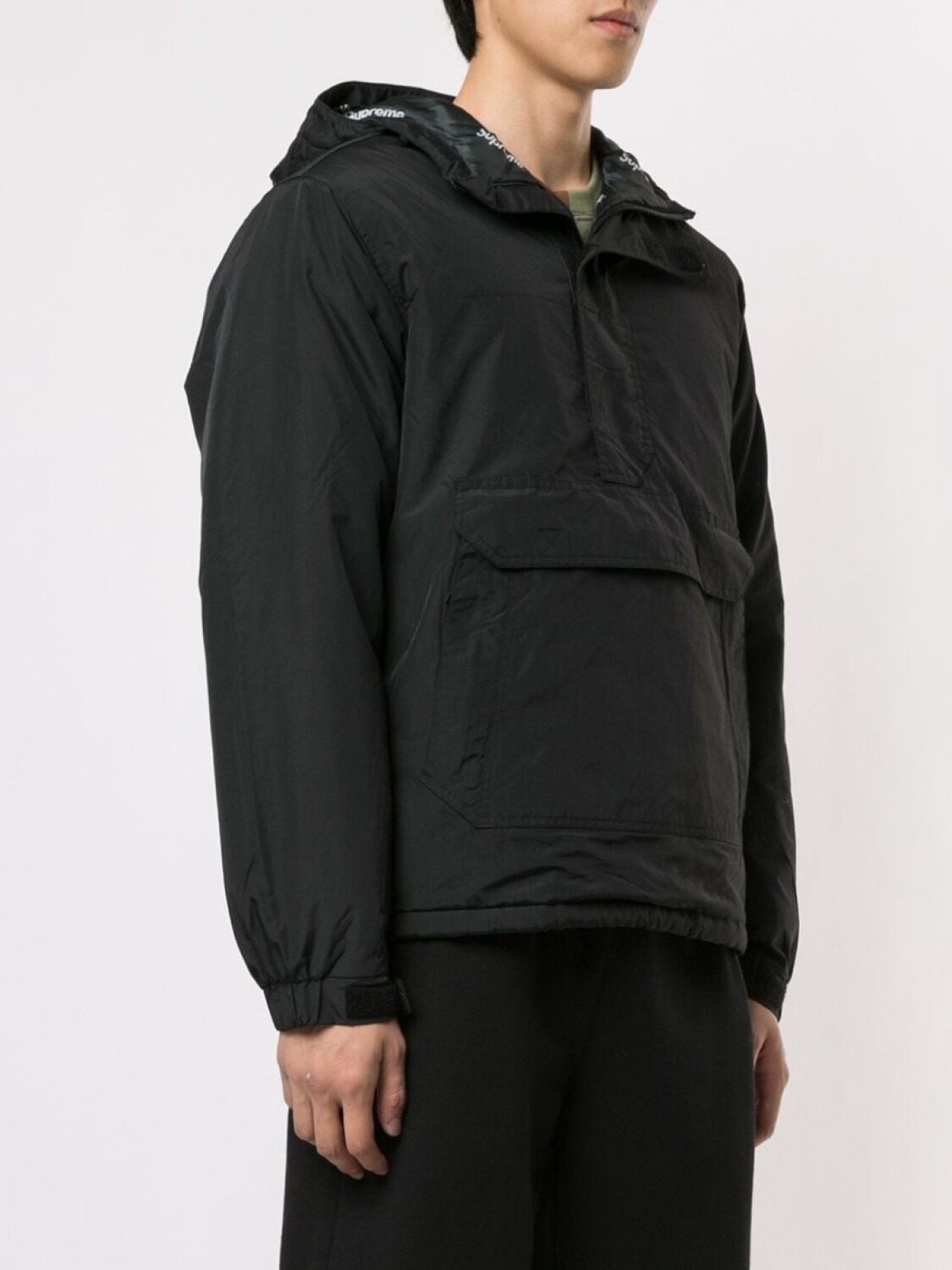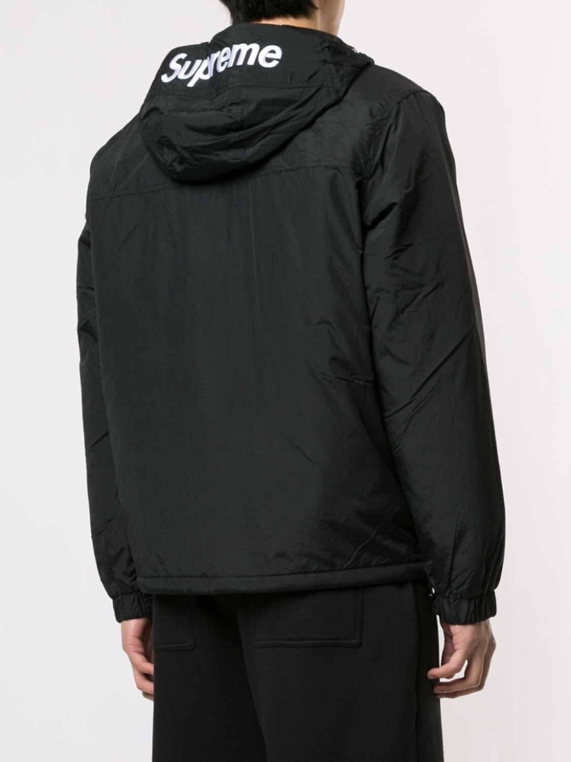 Анорак с воротником на молнии от Supreme. Капюшон, застежка на молнии спереди и карман-муфта. Цвет: черный. Эта модель представлена на маркетплейсе, где можно найти самые редкие модели одежды и кроссовок, о которых мечтают коллекционеры и любители streetwear по всему миру.