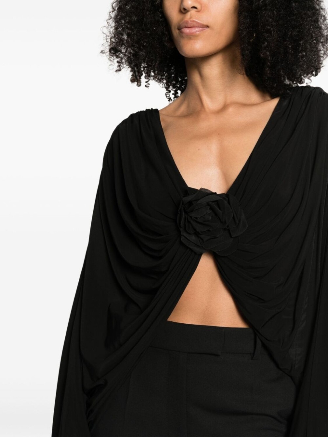 Подробнее о товаре: • черный • эластичный материал • декор в виде искусственного цветка • V-образный вырез • длинные рукава • закругленный подол • укороченная длина • Данный товар содержит более 50% сертифицированных древесных материалов. Материалы изготовления сертифицированы. Это гарантирует, что сырье заготовлено в ответственных лесных хозяйствах, которые минимизируют вырубку лесов, обеспечивают справедливую заработную плату и условия труда, сохраняют биоразнообразие и уважают права локальных сообществ.