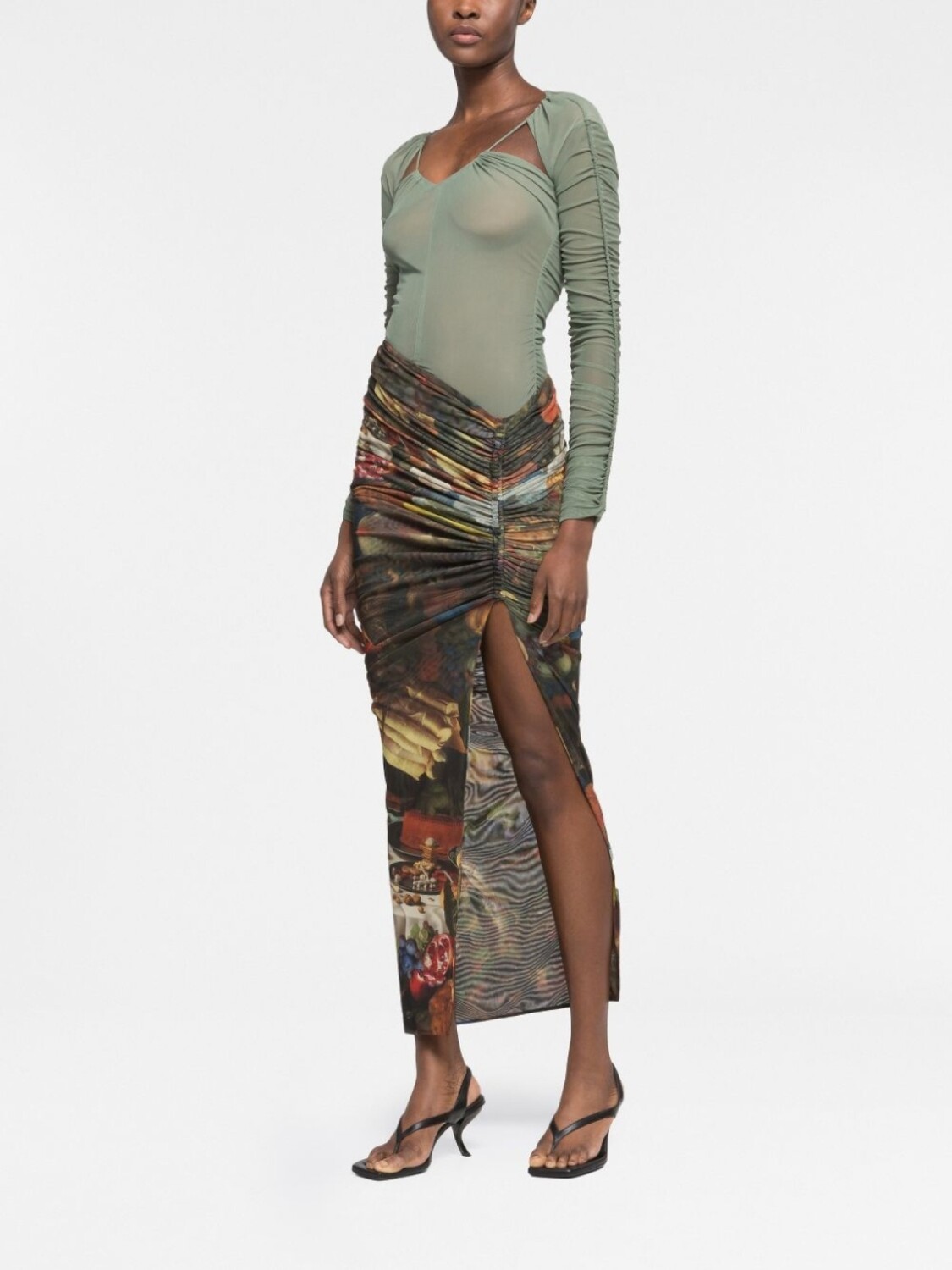 Хаки, эластичный материал, полупрозрачный дизайн, U-образный вырез, детали с оборками, вырезные детали, длинные рукава и закругленный подол сзади.