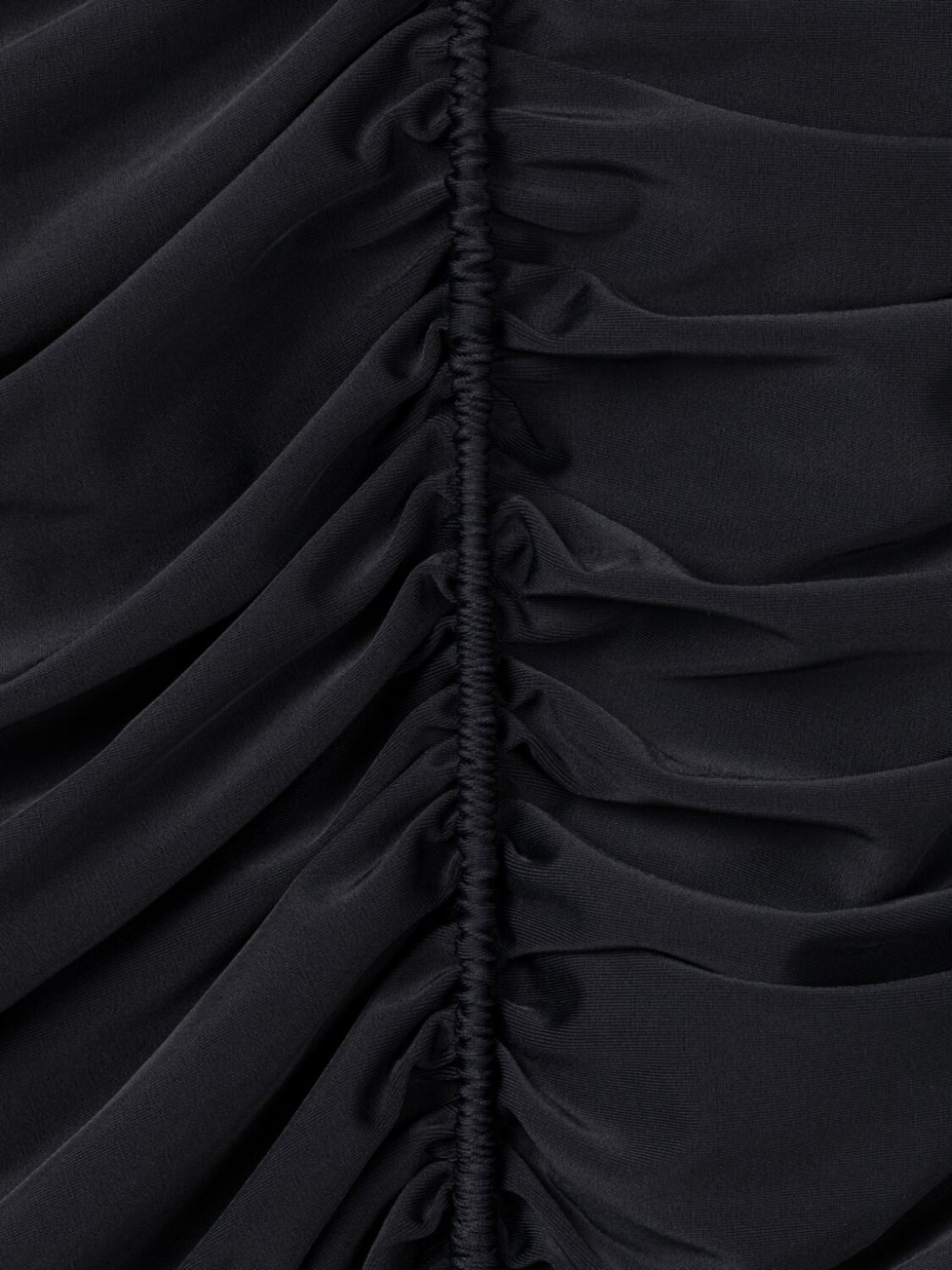 Черный, эластичный материал, детали с оборками, асимметричная форма и длинные рукава.