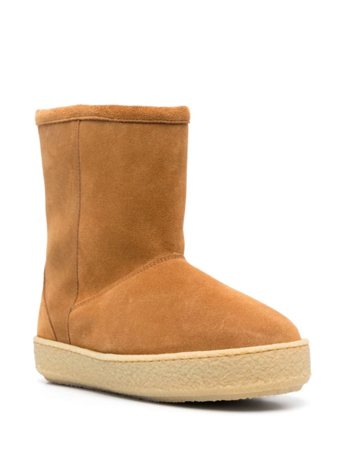 Бежево-коричневый, замша из телячьей кожи, подкладка из овечьей шерсти, строчка в тон, закругленный носок, модель без застежки, высота по щиколотку, стелька с логотипом, плоская платформа и плоская резиновая подошва.