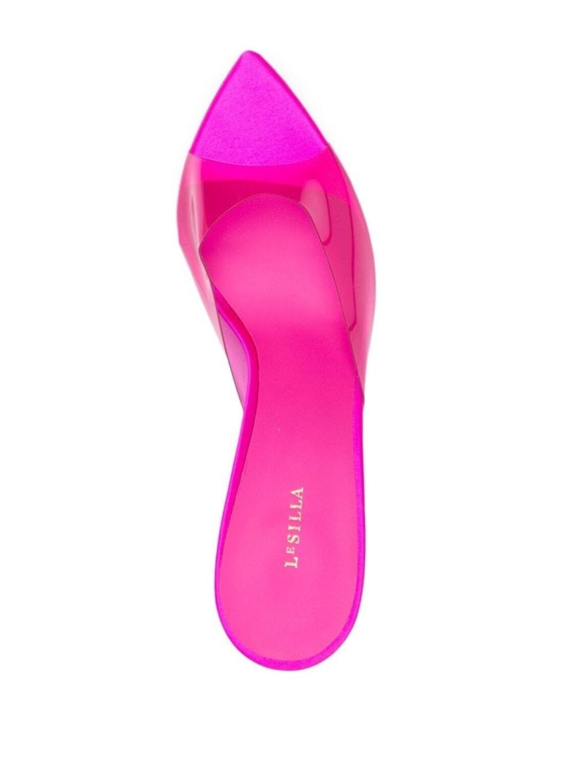 Фуксия, телячья кожа, прозрачное покрытие, открытый носок, модель без застежки и высокий каблук.
