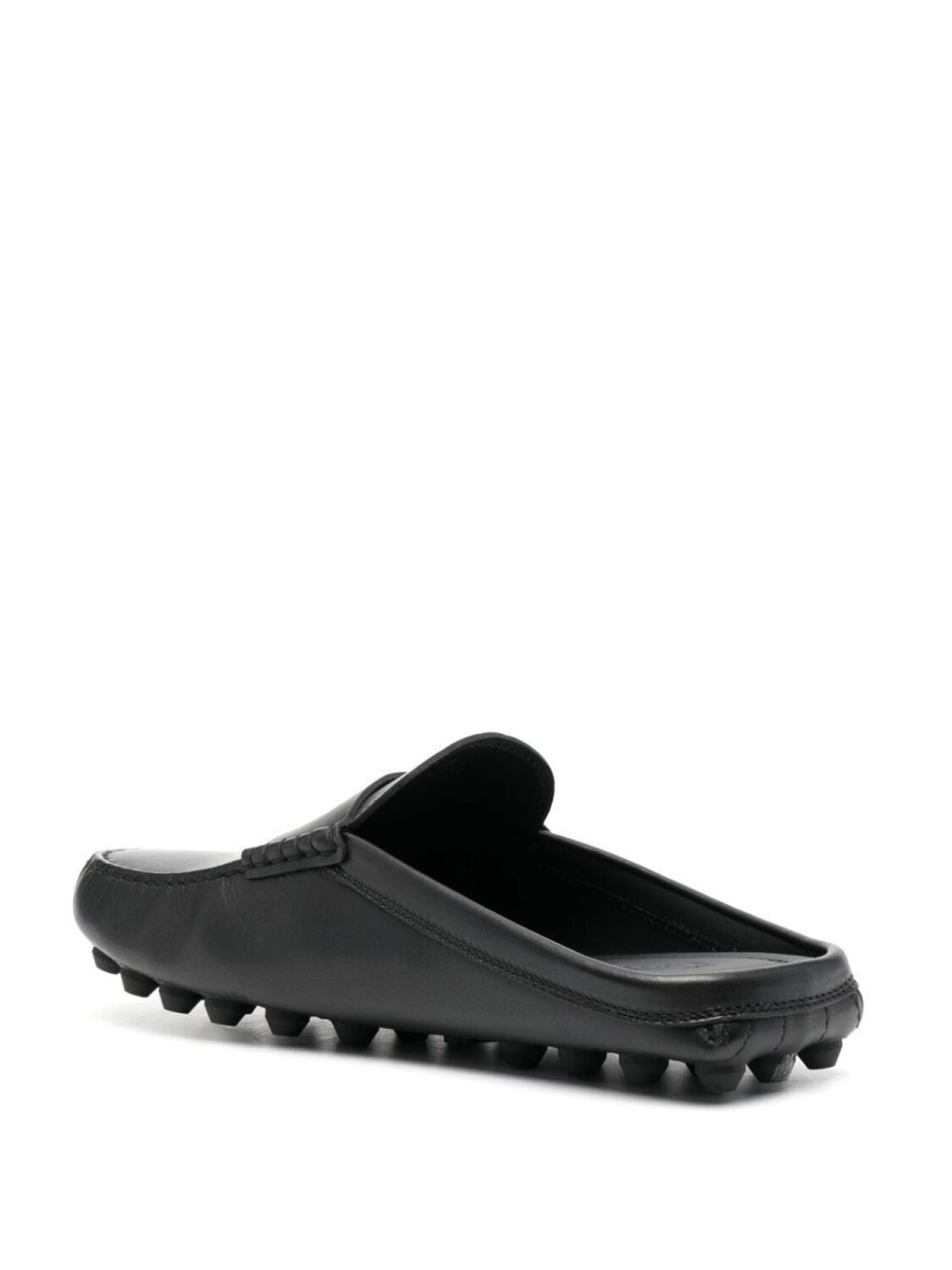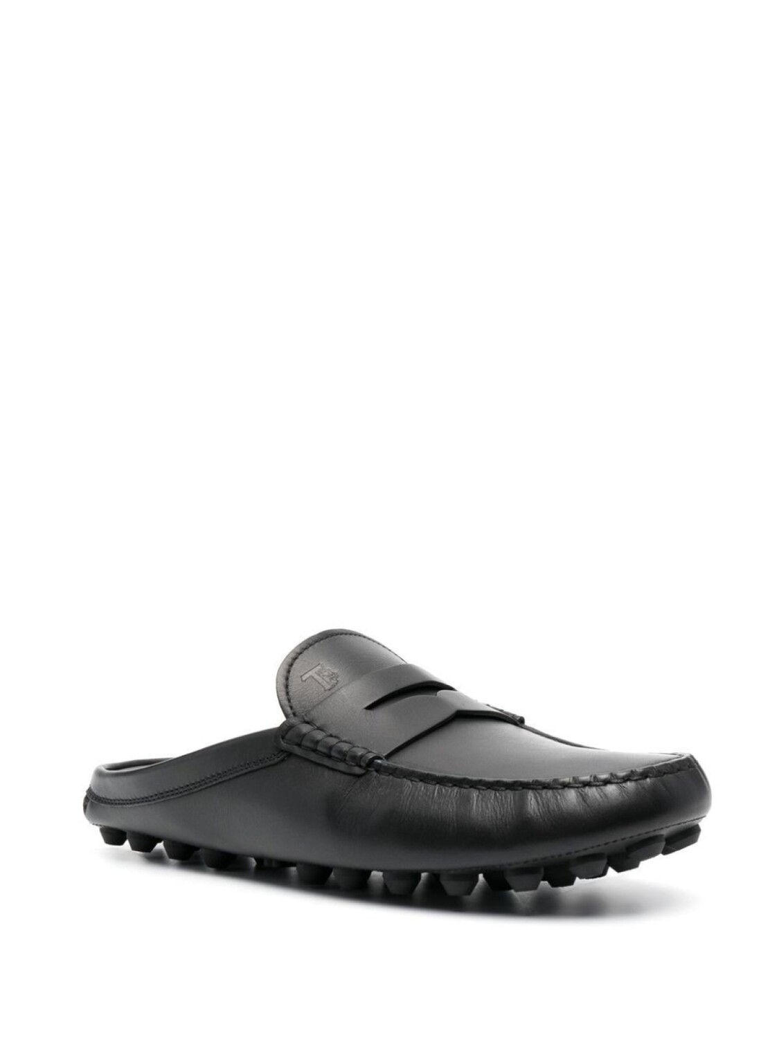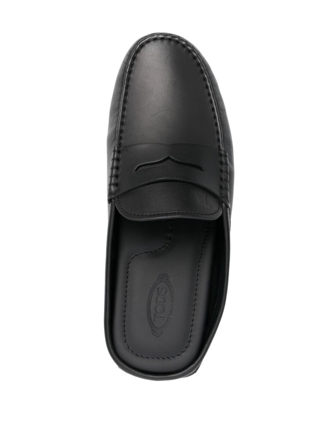 Черный, телячья кожа, прорези на язычке, тисненый логотип спереди, декоративная строчка, миндалевидный носок, кожаная стелька с логотипом, без задника, модель без застежки и подошва Gommino.