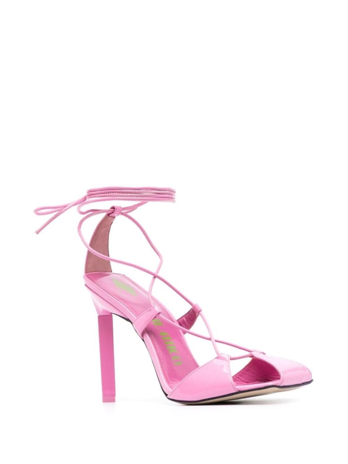 Светло-розовый, телячья кожа, завязка на щиколотке, шнуровка спереди, квадратный носок и каблук на высокой шпильке.