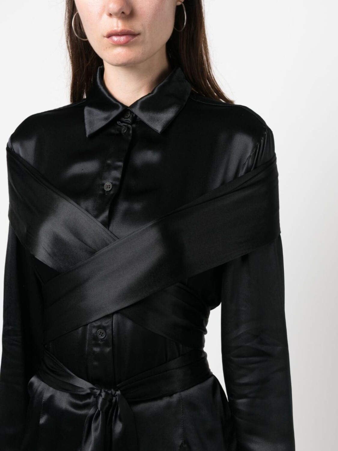 Черный, сатиновая фактура, несколько оборотов, ремешки, классический воротник, застежка на пуговицах спереди, длинные рукава, манжеты на пуговицах, кулиска на талии и закругленный подол. Узнать больше о том, какие товары получают отметку «Ответственный выбор», можно из материала «Как мы оцениваем экологичность и этичность».