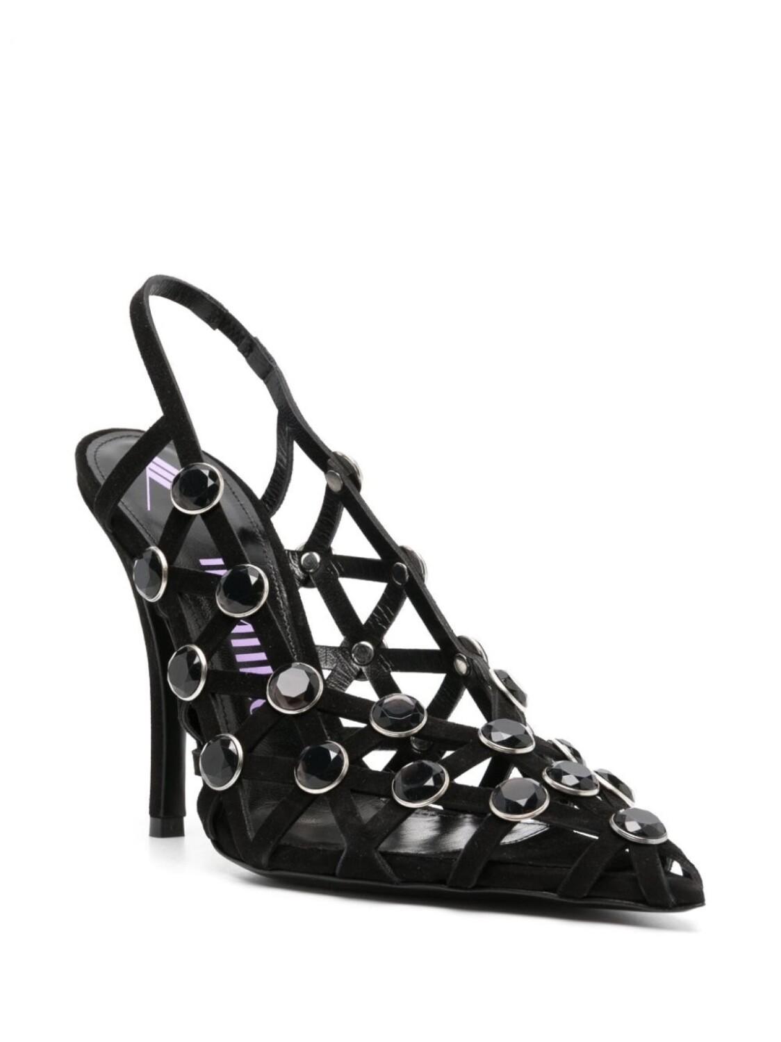 Черный, замша из телячьей кожи, декор из кристаллов, заостренный носок, ремешок на пятке, каблук-шпилька, кожаная стелька с логотипом и кожаная подошва.