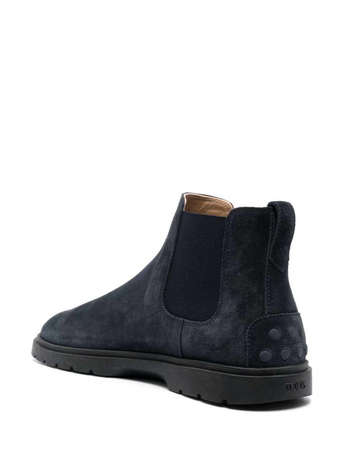 Темно-синий, замша из телячьей кожи, строчка в тон, тисненый логотип сзади, эластичные боковые вставки, петля для подтягивания сзади, закругленный носок, кожаная стелька с логотипом и резиновая подошва.