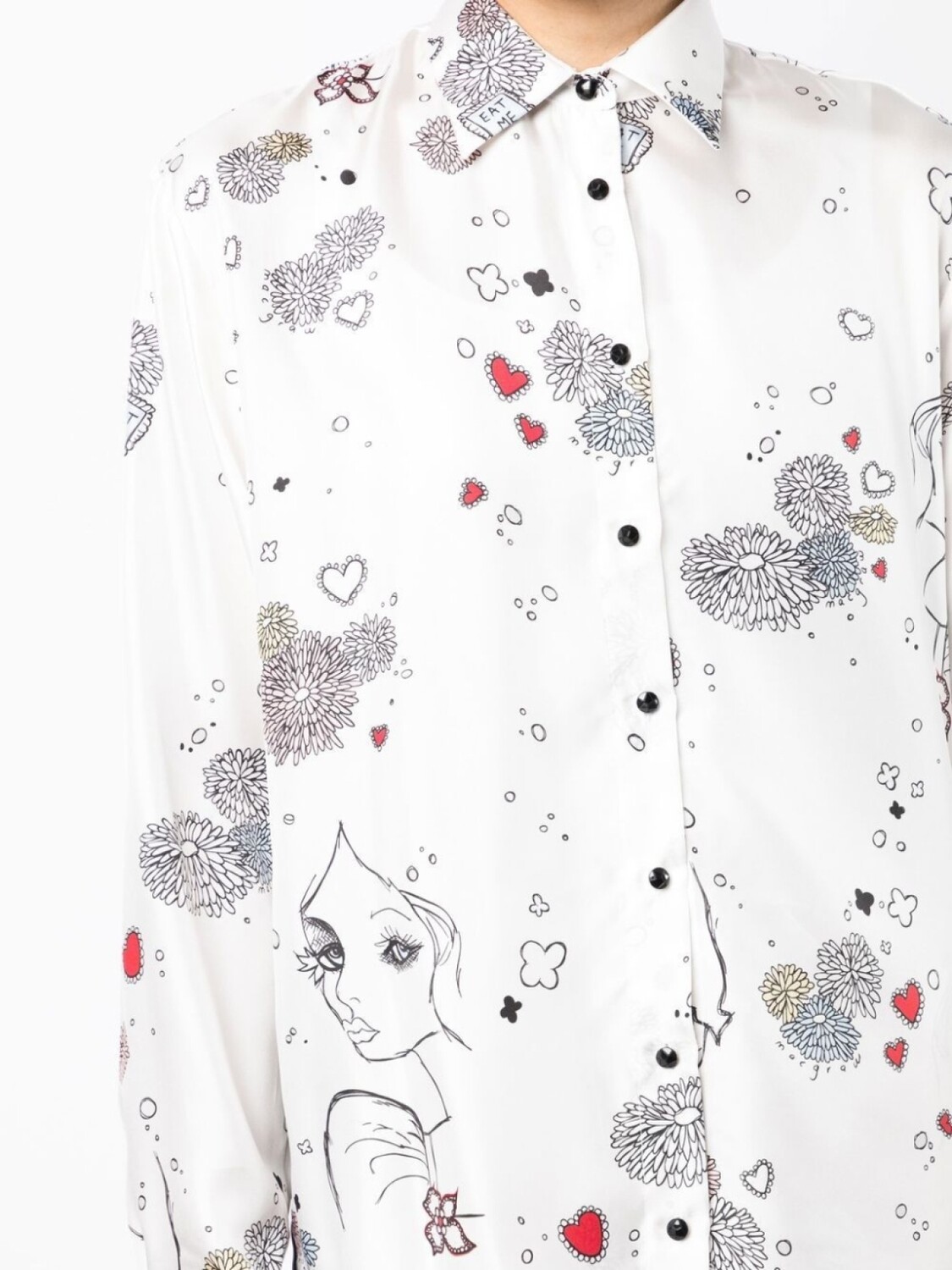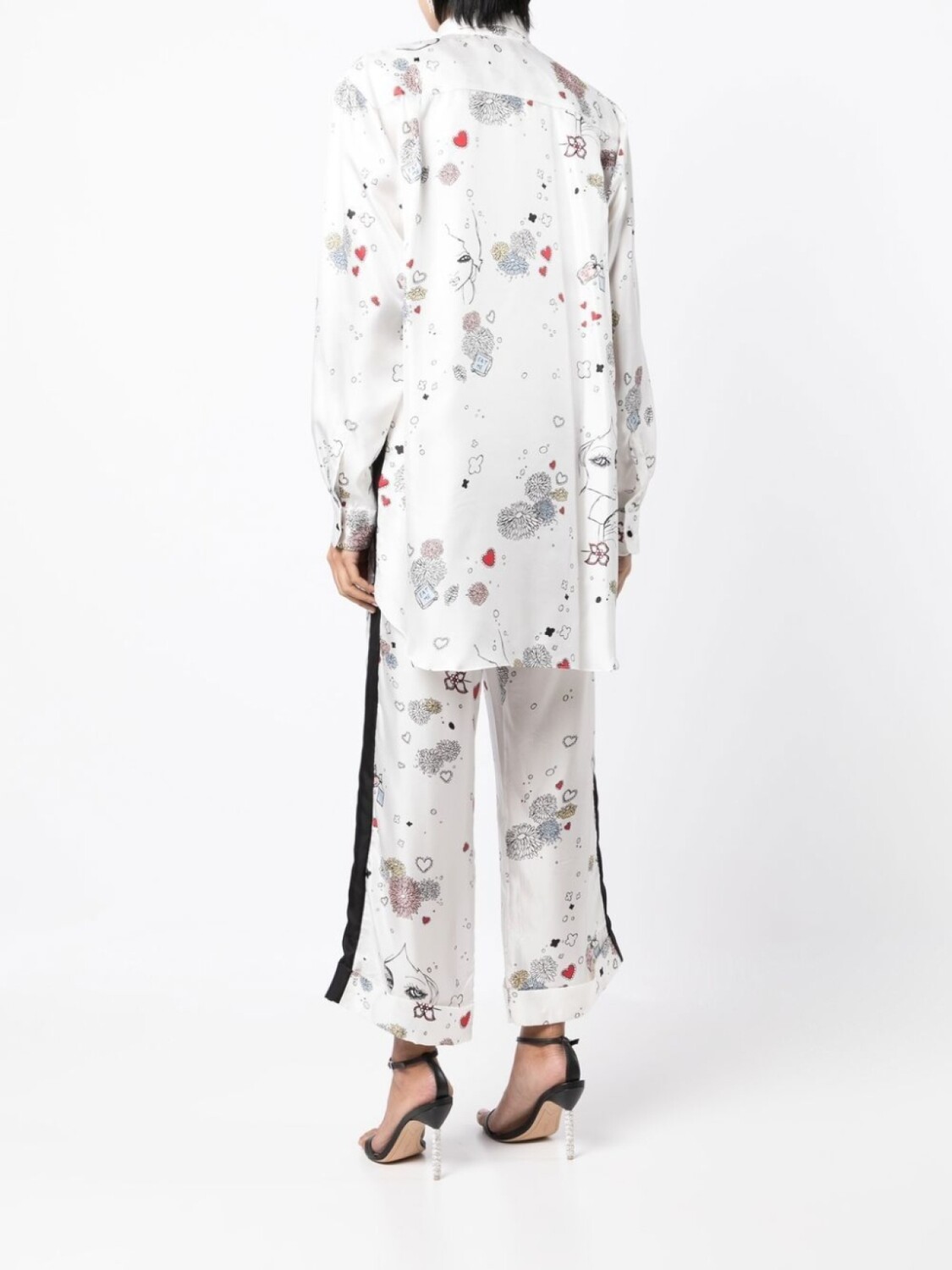 Белый/разноцветный, шелк, классический воротник, застежка на пуговицах спереди, длинные рукава, манжеты на пуговицах, прямой подол и длина до бедер.