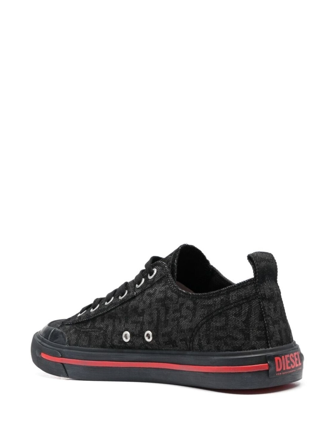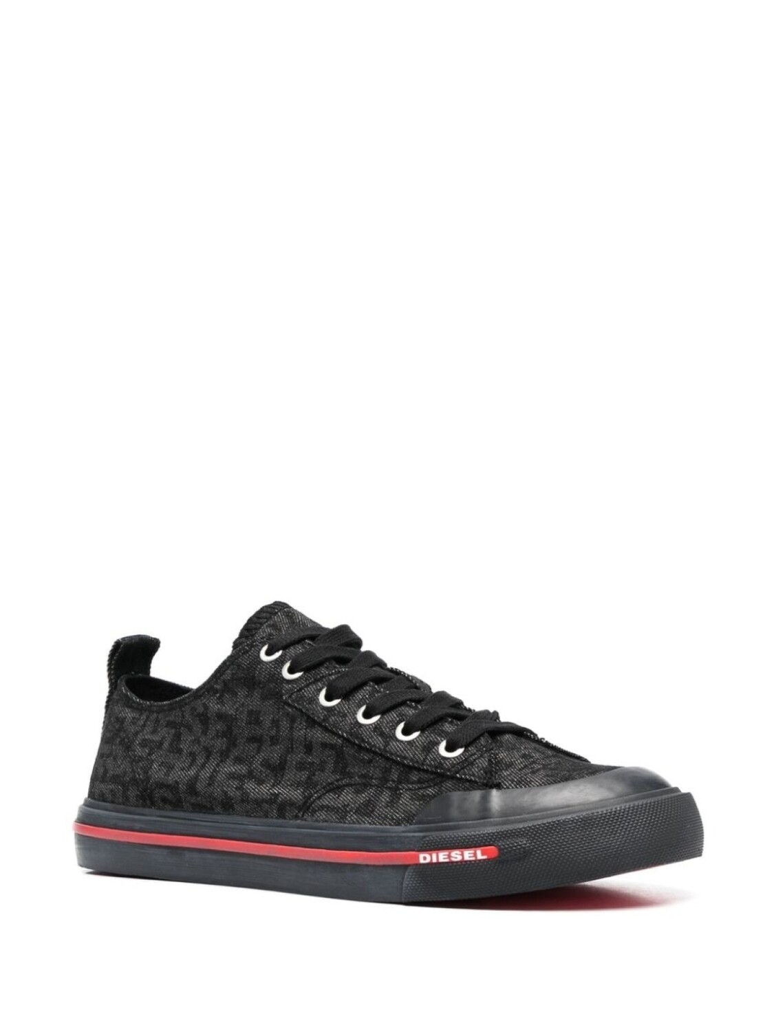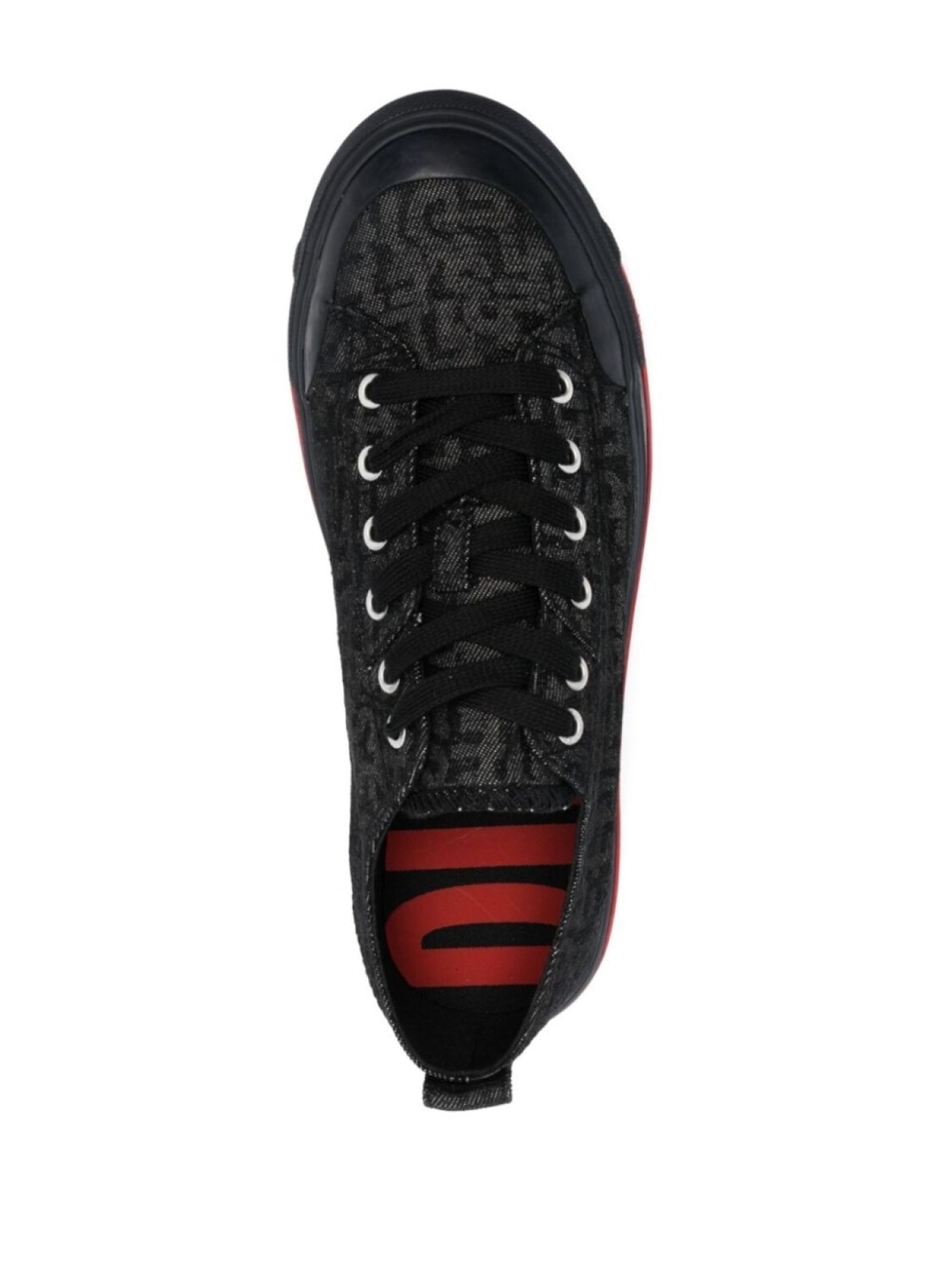 Черный, парусина, сплошной принт с логотипом, закругленный носок, шнуровка спереди, петля для подтягивания сзади и плоская резиновая подошва.