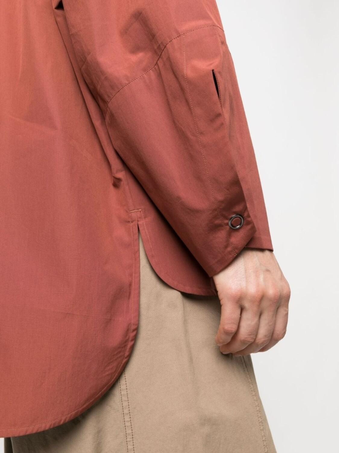 Оранжевый, хлопок, строчка в тон, воротник-стойка, застежка на пуговицах спереди, длинные рукава, закругленный подол и манжеты на пуговицах.