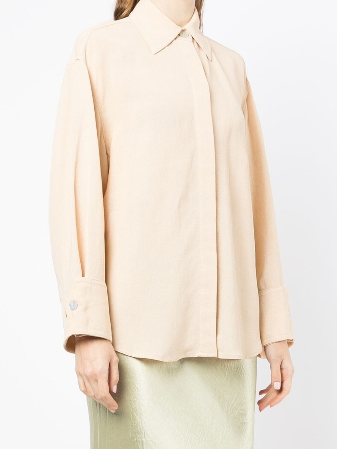 Застежка на завязке сзади, открытая спина, застежка на пуговицах спереди, классический воротник, длинные рукава, манжеты на пуговицах и прямой подол.