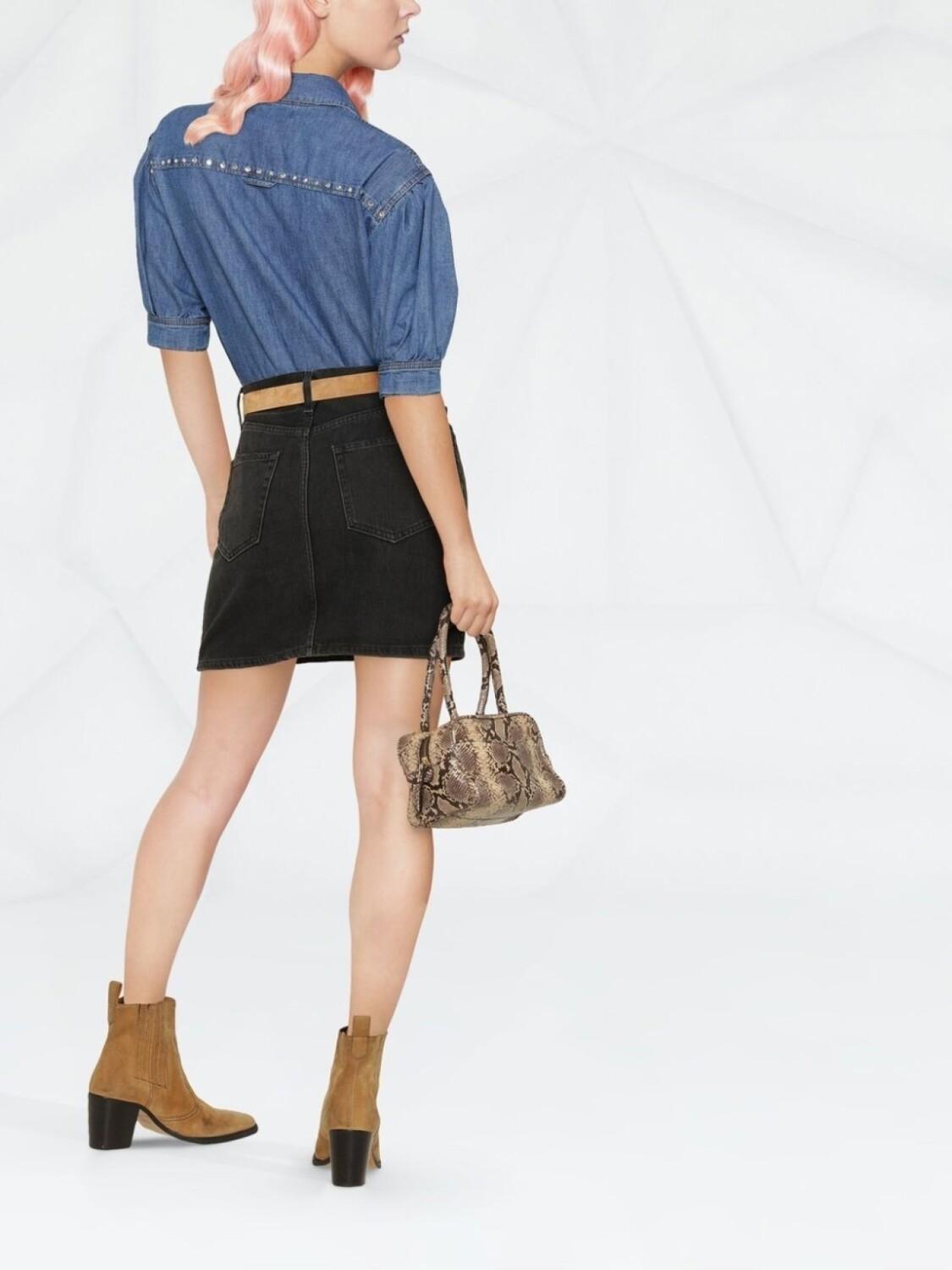 Синий, хлопок, классический воротник, застежка на кнопках спереди, короткие объемные рукава, два нагрудных кармана с клапанами и декор из кристаллов.