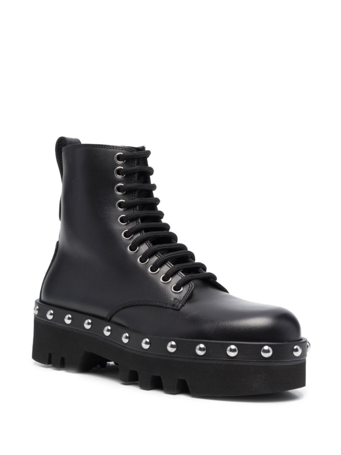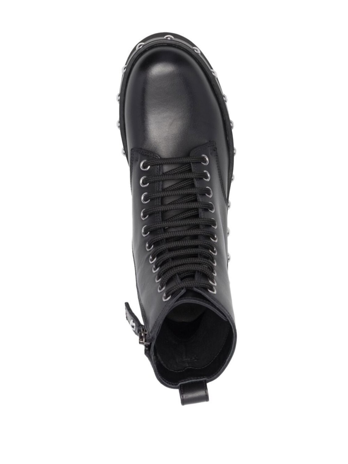 Черный, кожа, серебристые заклепки, закругленный носок, шнуровка спереди и рифленая резиновая подошва.