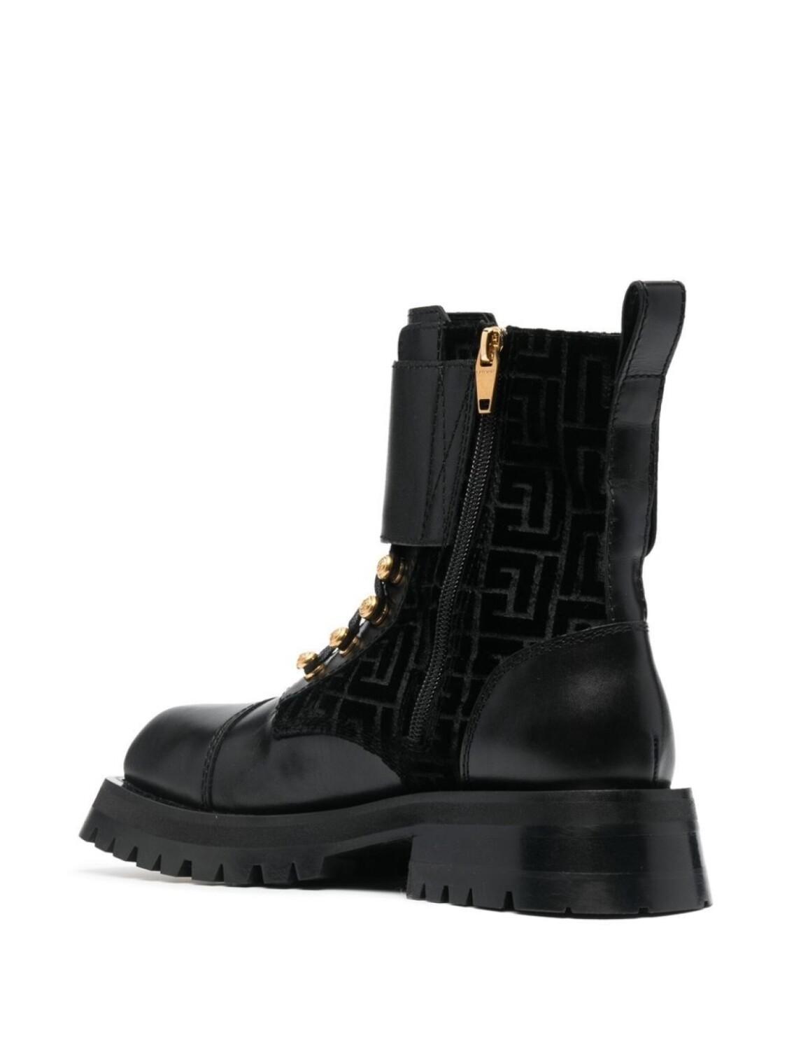 Черный, телячья кожа, высота по щиколотку, золотистые пуговицы с тиснением, узор с изображением монограммы, закругленный носок, шнуровка спереди, стелька с логотипом и рифленая резиновая подошва.