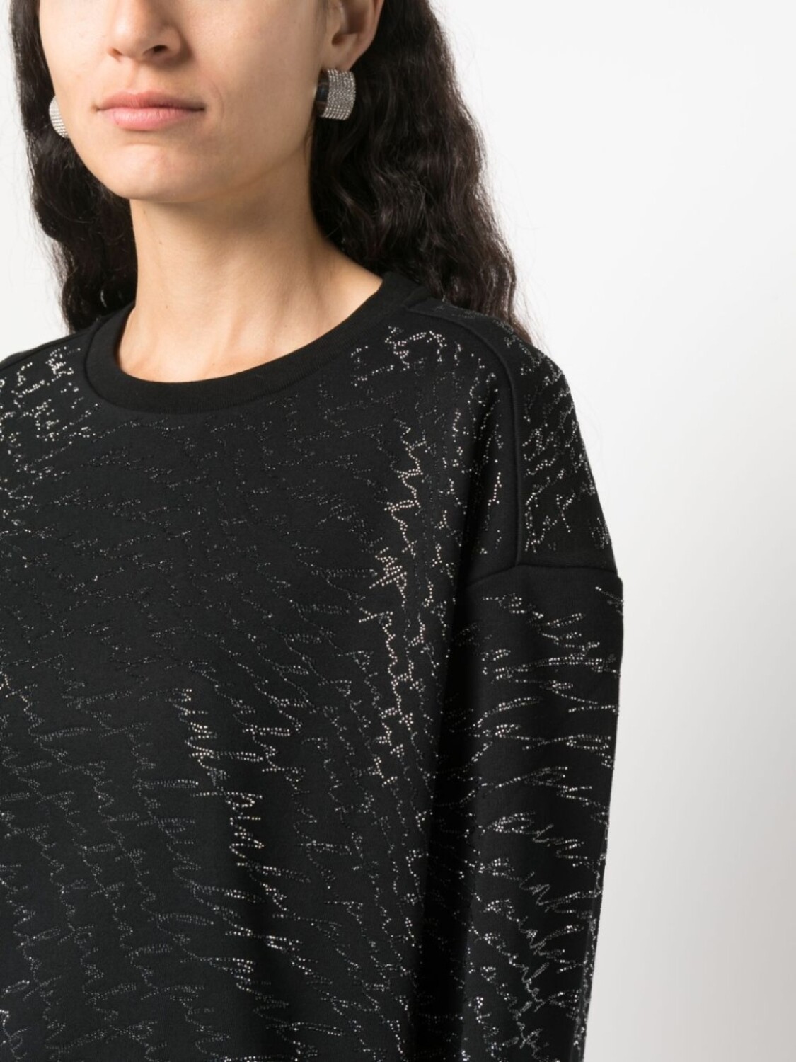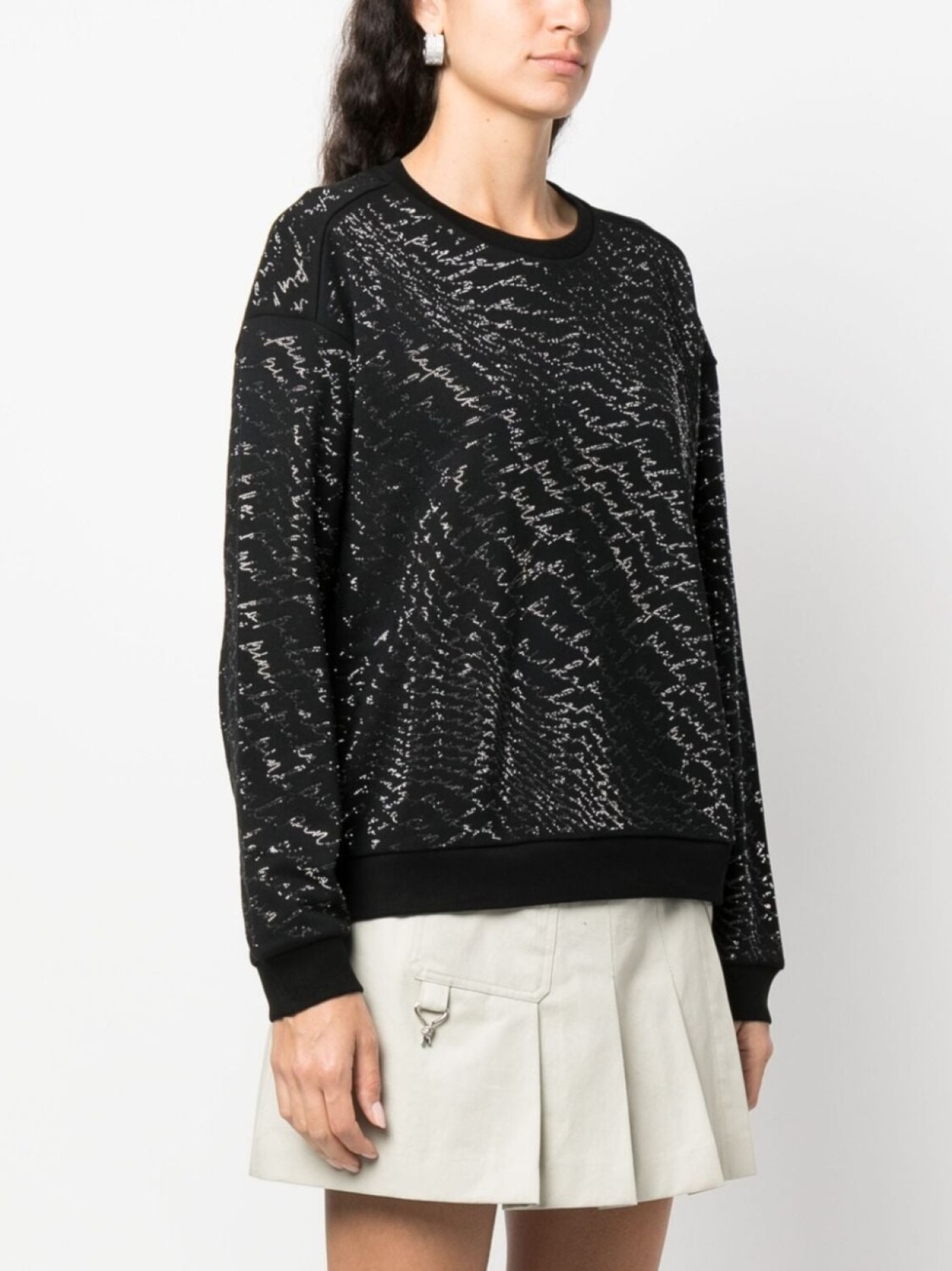 Черный, декор из кристаллов, круглый вырез, длинные рукава, эластичные манжеты и прямой подол.