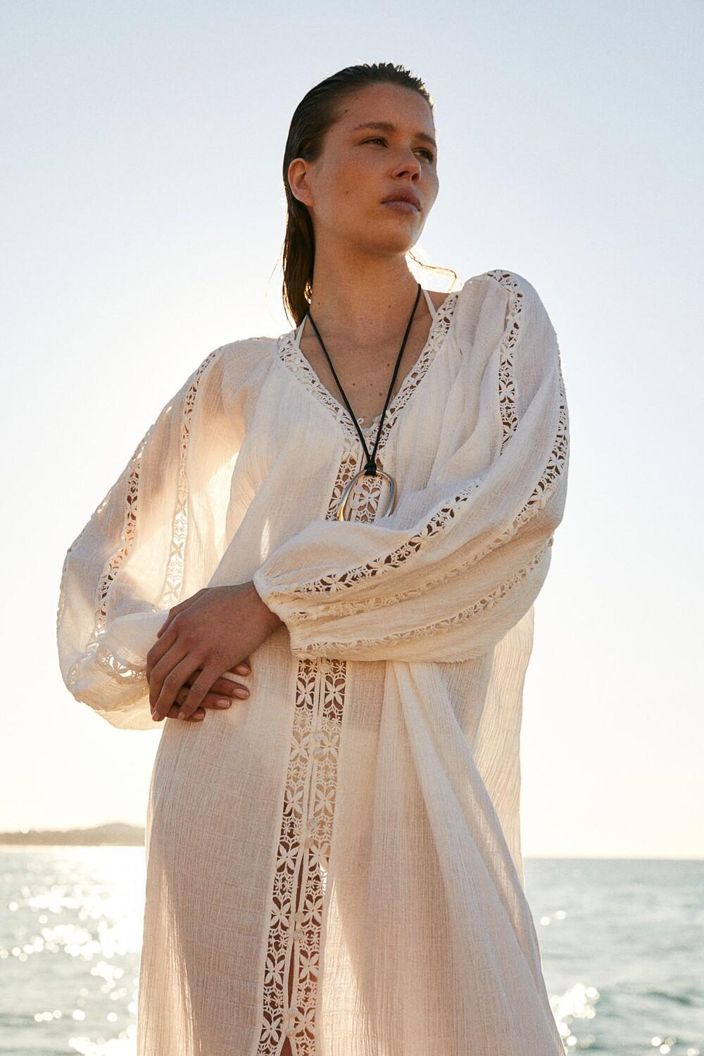 Платье длиной до середины икры из мятой хлопчатобумажной ткани с кружевной отделкой и вставками. Свободная посадка. V-образный вырез, пуговицы спереди, длинные рукава-фонарики кроя реглан и края на резинке. Без подкладки.