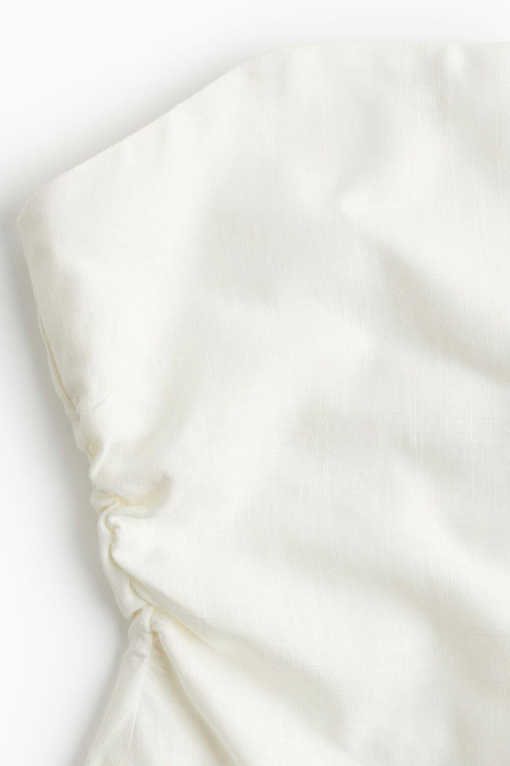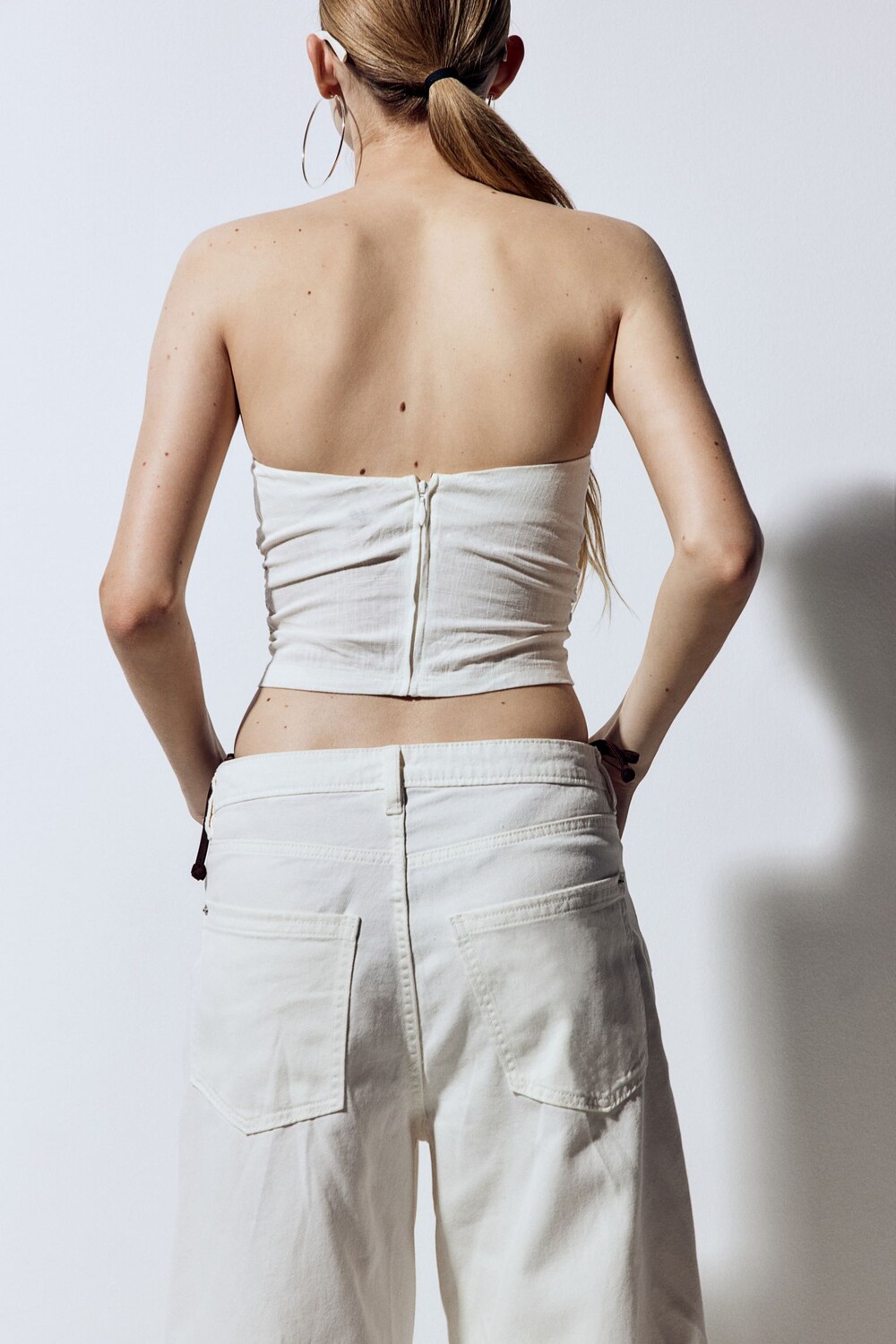 Укороченный топ-бандо. Присборенные швы по бокам создают эффект легкой драпировки. Потайная молния и застежка на крючок сзади. Без подкладки.