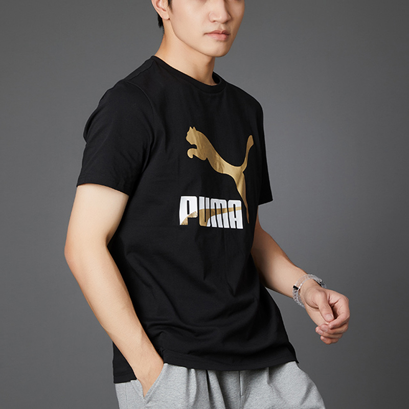 Артикул 532280-01 соответствует мужской футболке PUMA в цветовом решении Black / Gold (черный с золотистым логотипом). Это базовая модель из линейки Classics, предназначенная для повседневной носки и легких тренировок.