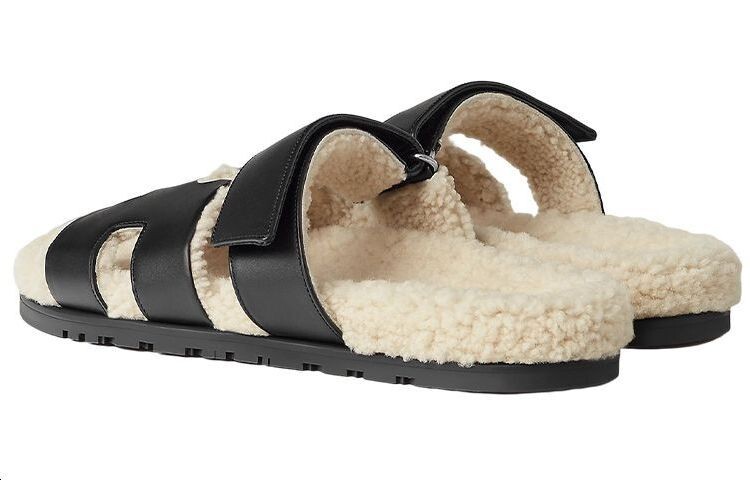 Мужские шлепанцы Hermes с мехом, черный/белый