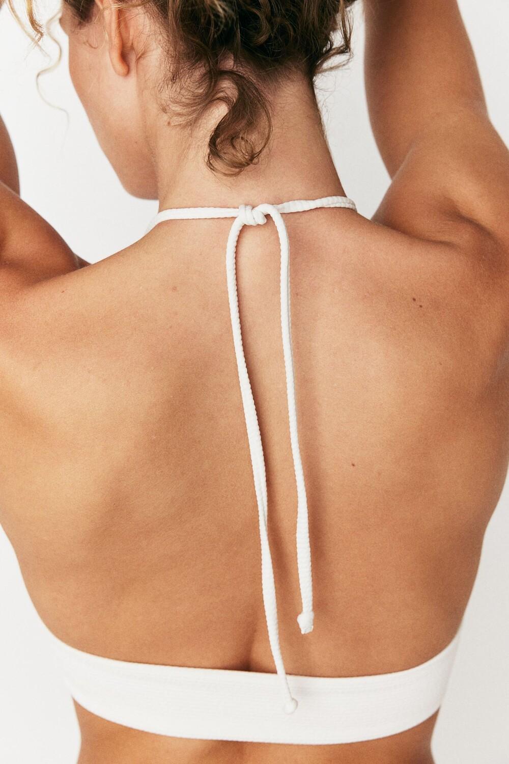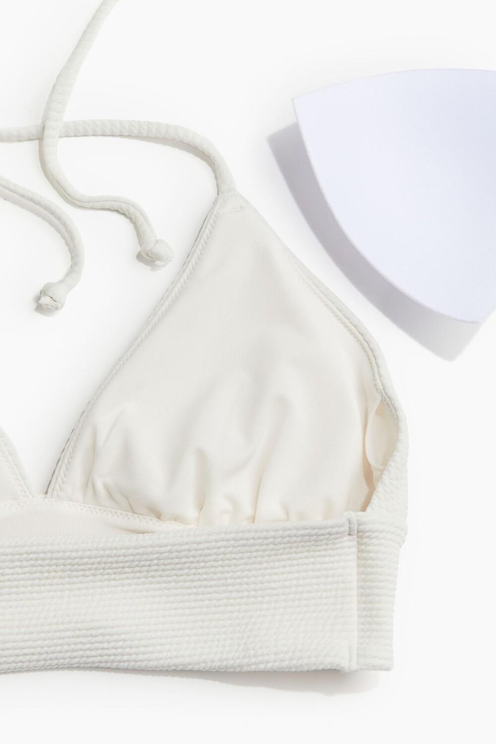 Бюстгальтер бикини без косточек и застежки. Треугольные чашки с подкладкой и съемными вставками обеспечивают хорошую поддержку и форму груди. Ленты для завязывания на шее. Широкий край внизу.