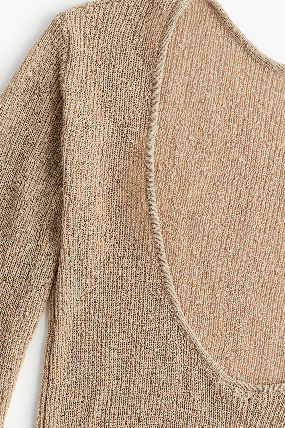 Короткое трикотажное платье с глубоким круглым вырезом сзади. Слегка расклешенные длинные рукава.