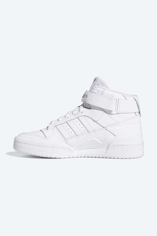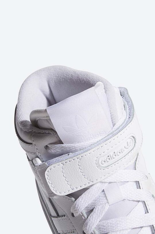 Приподнятый верх, рифленая подошва. Закругленный носок и жесткая пятка Adidas Forum Mid J FZ2086 завершают образ. Обувь на шнуровке Дополнительно оснащенные специальным ремешком на липучке на лодыжке, они являются одной из самых популярных моделей бренда.