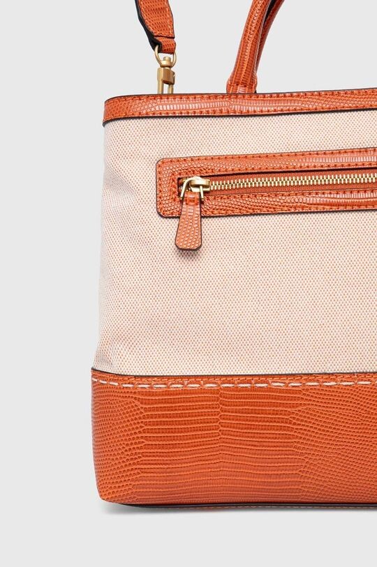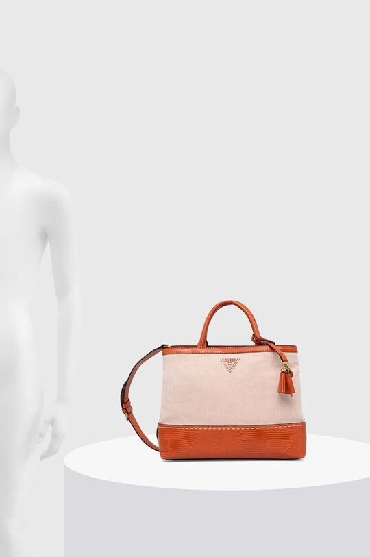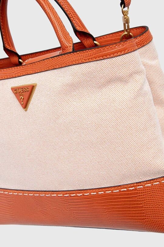 Сумочка среднего размера из коллекции Guess. Застегивающаяся модель из комбинации текстильного материала и экологической кожи.