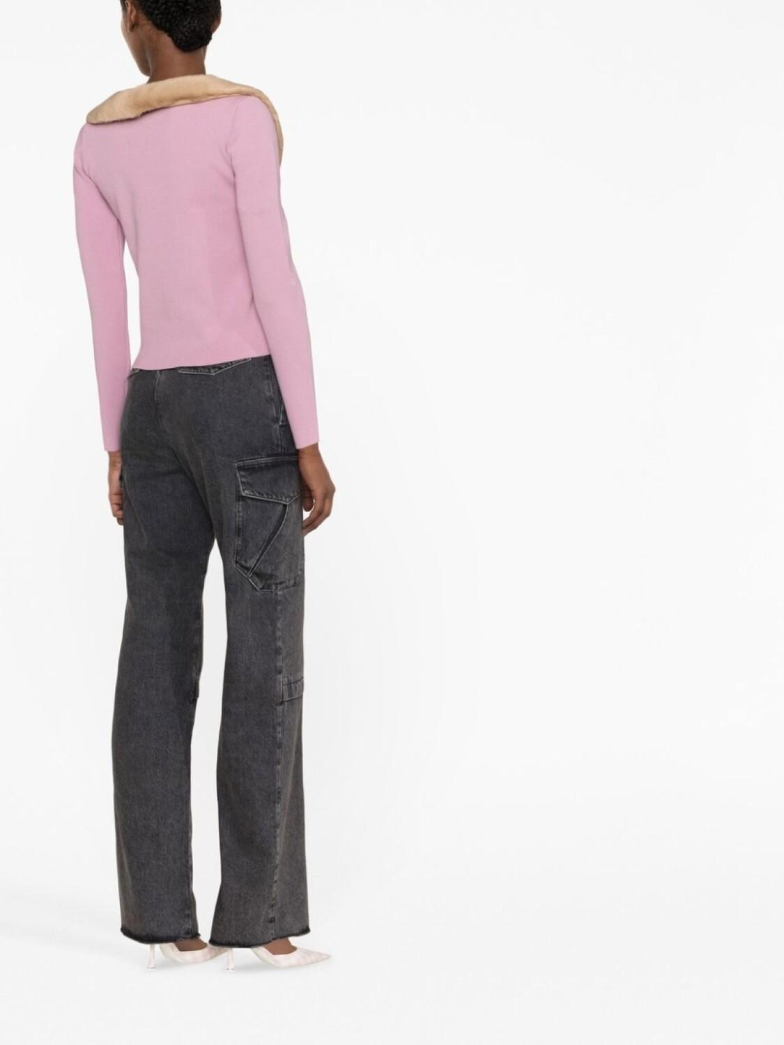 Розовый, тонкая вязка, искусственная овчина, контрастный воротник, застежка на пуговицах спереди и длинные рукава.
