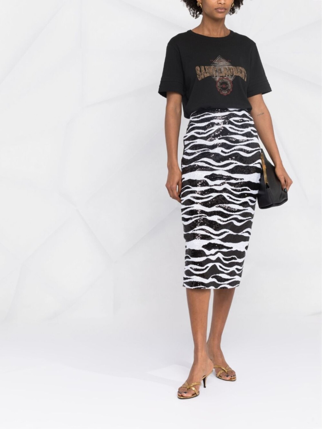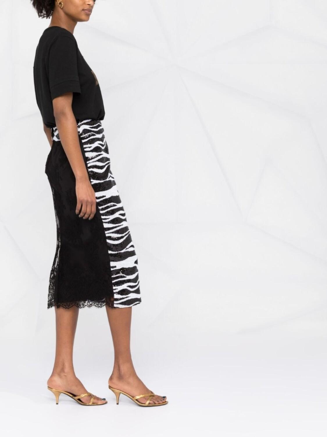 Завышенная талия, потайная застежка сзади, зебровый принт, кружевные вставки, пайетки и силуэт «карандаш».