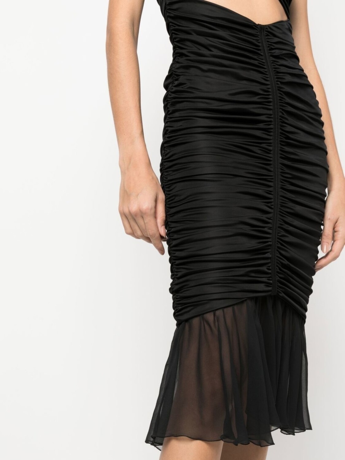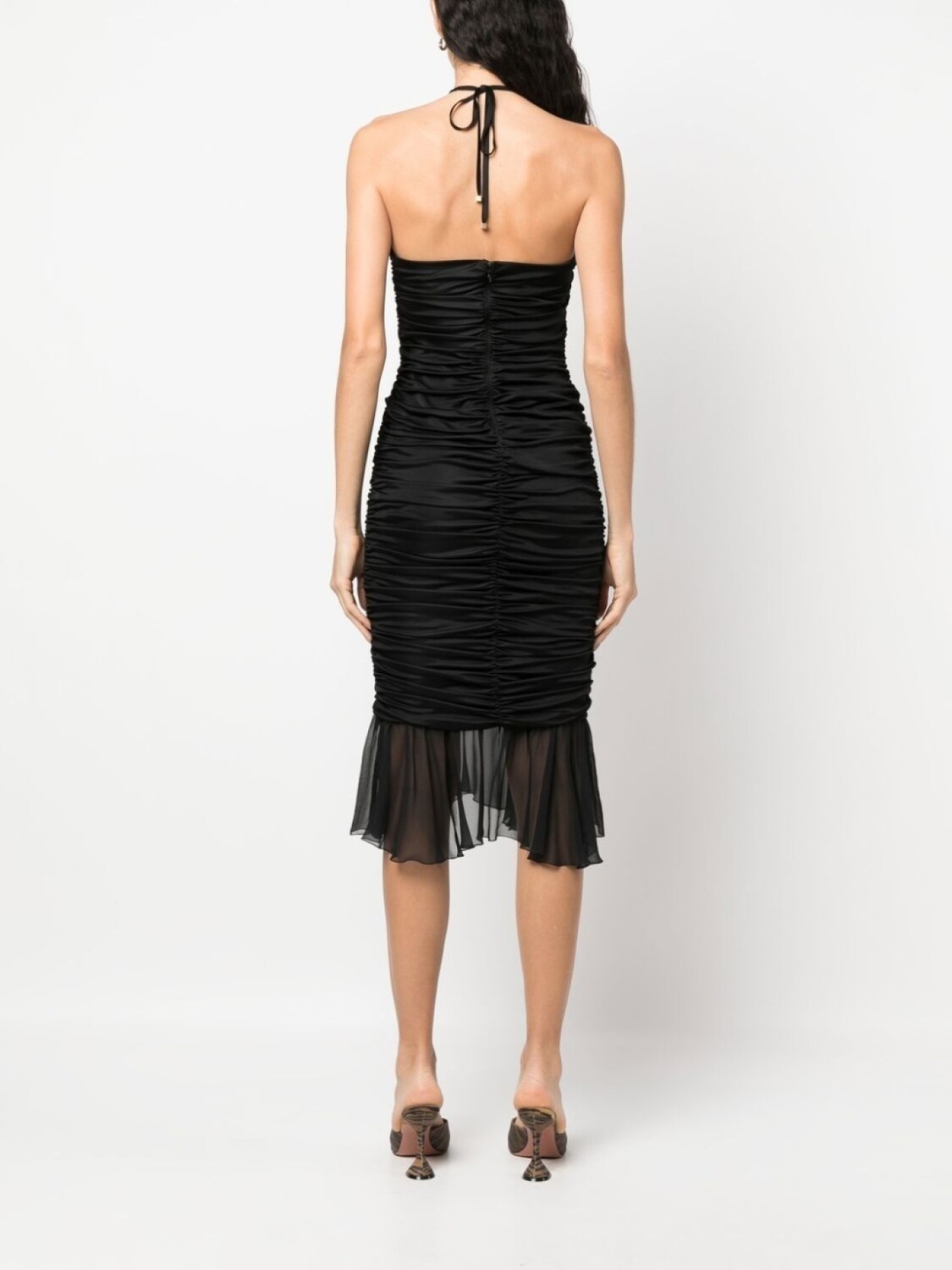 Черный, шелк, плиссированная модель, подол с оборками, вырезные детали, открытая спина, завязки вокруг шеи, без бретелей и длина по колено.