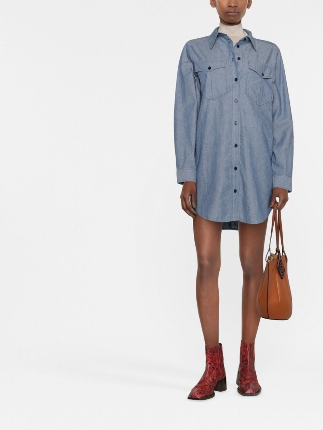 Синий, хлопок, ткань шамбре, классический воротник, застежка на пуговицах спереди, два передних кармана с клапанами, длинные рукава, манжеты на пуговицах и неравномерный подол.