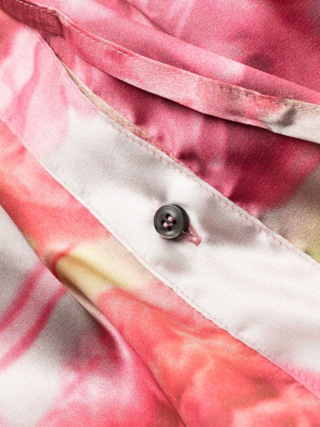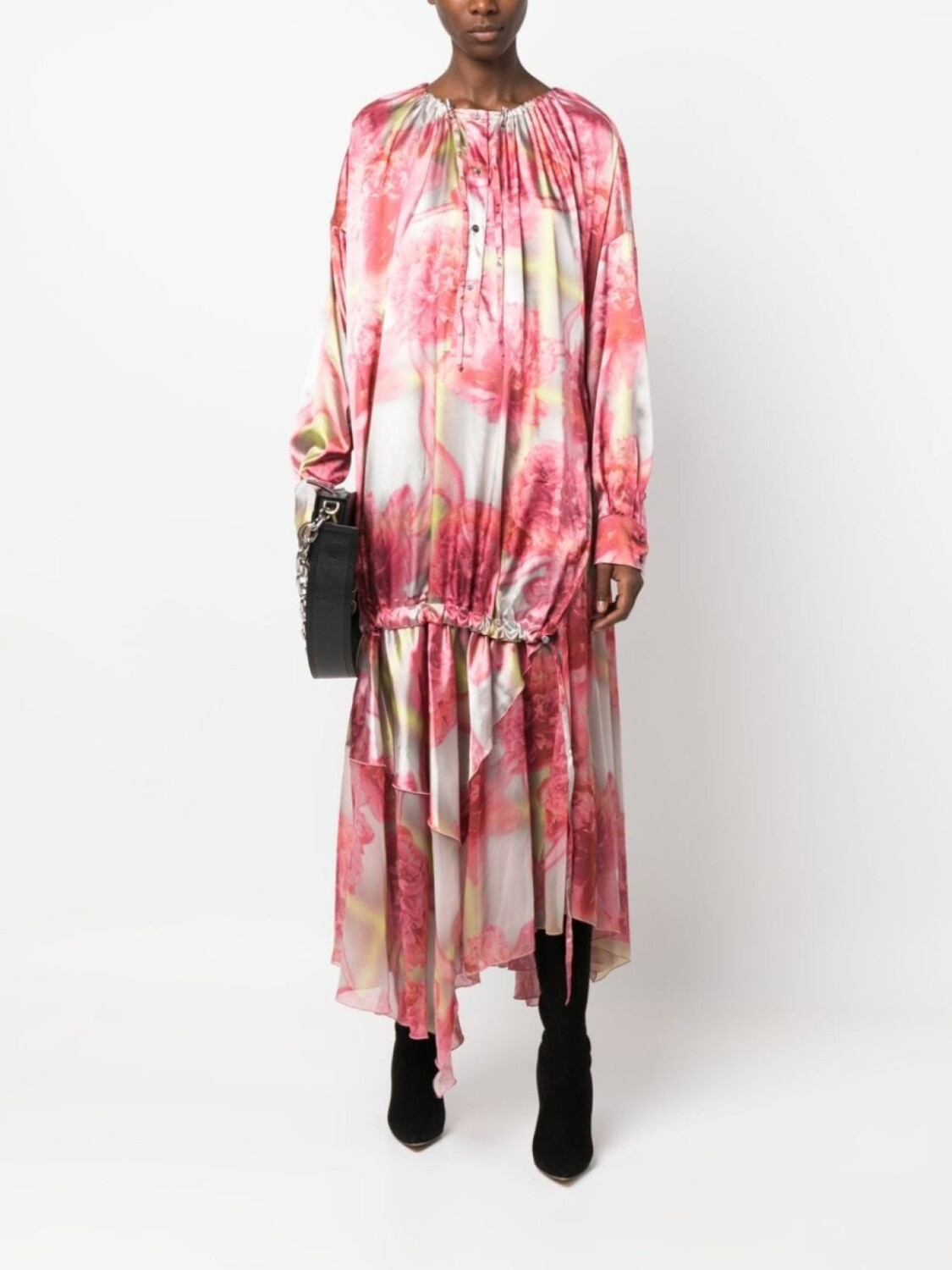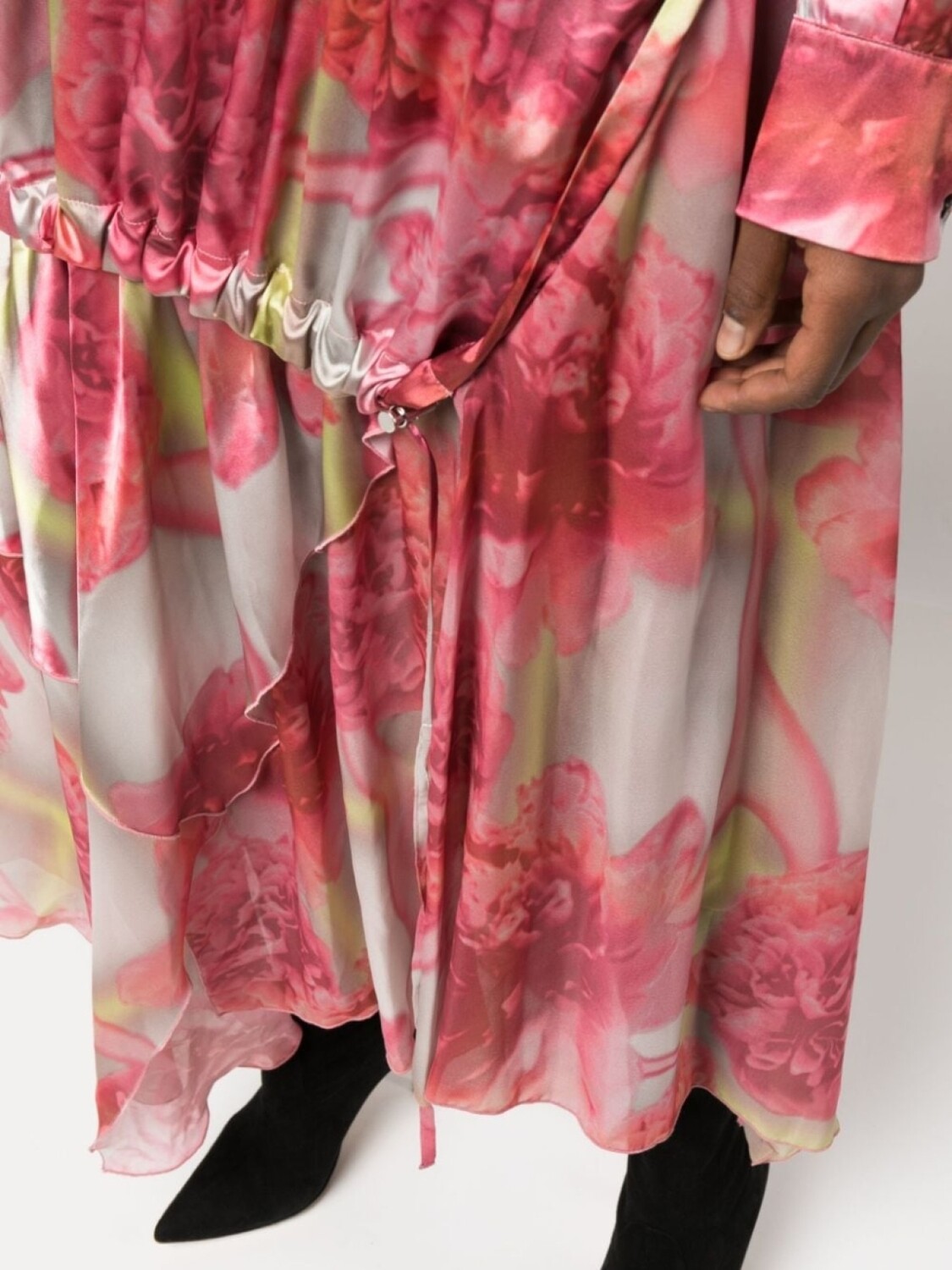 Сатиновая фактура, сплошной цветочный принт, неравномерный подол, приспущенные плечи, кулиска, рукава с манжетами на пуговицах, застежка на пуговицах спереди и длинная модель.