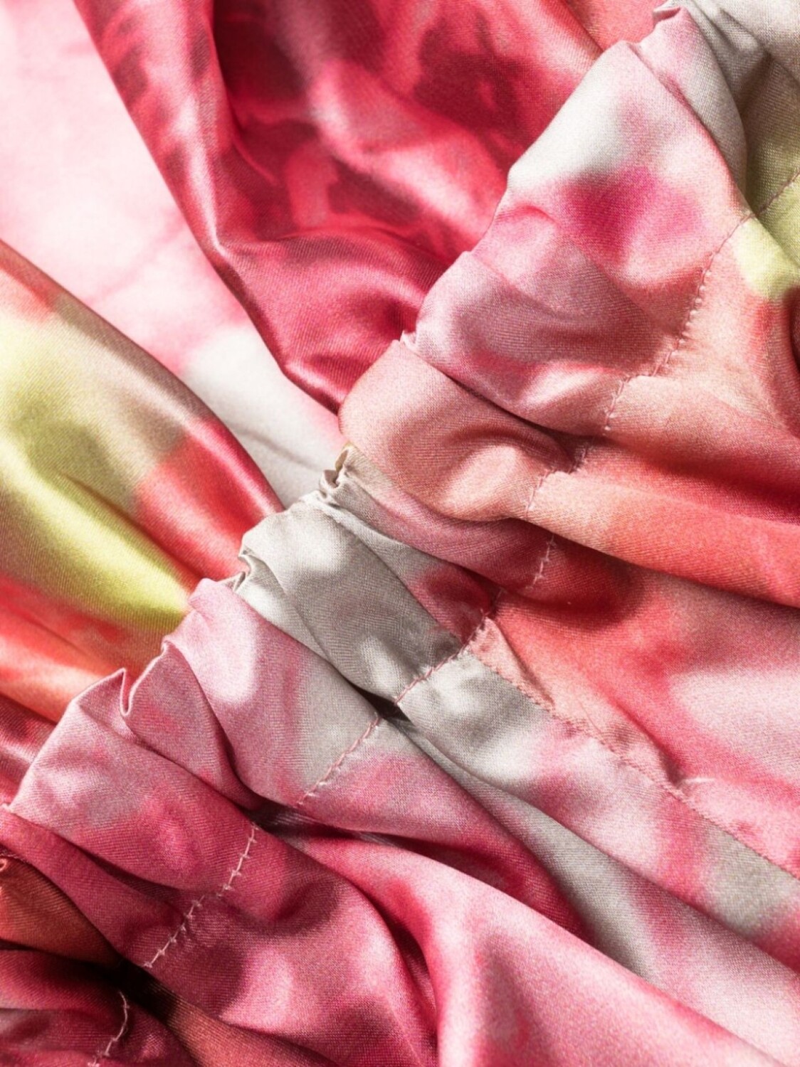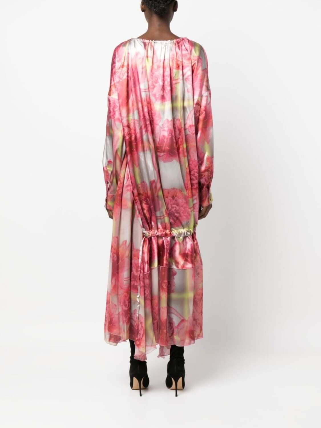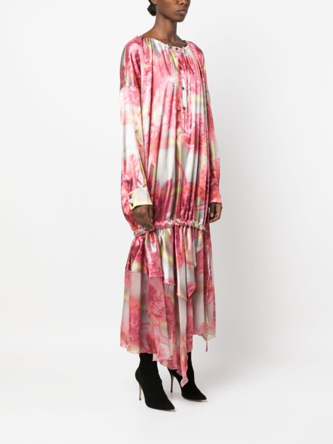 Сатиновая фактура, сплошной цветочный принт, неравномерный подол, приспущенные плечи, кулиска, рукава с манжетами на пуговицах, застежка на пуговицах спереди и длинная модель.