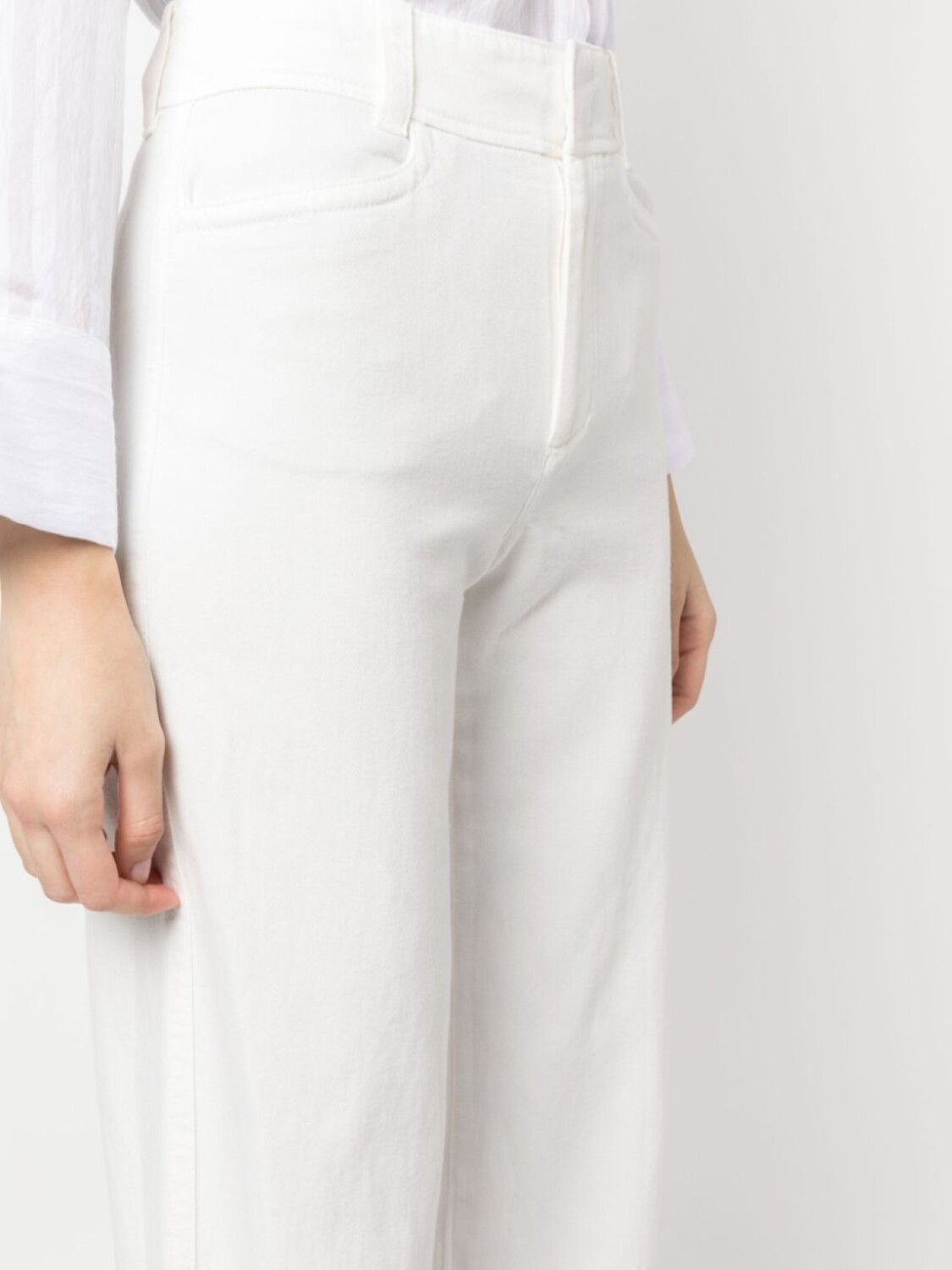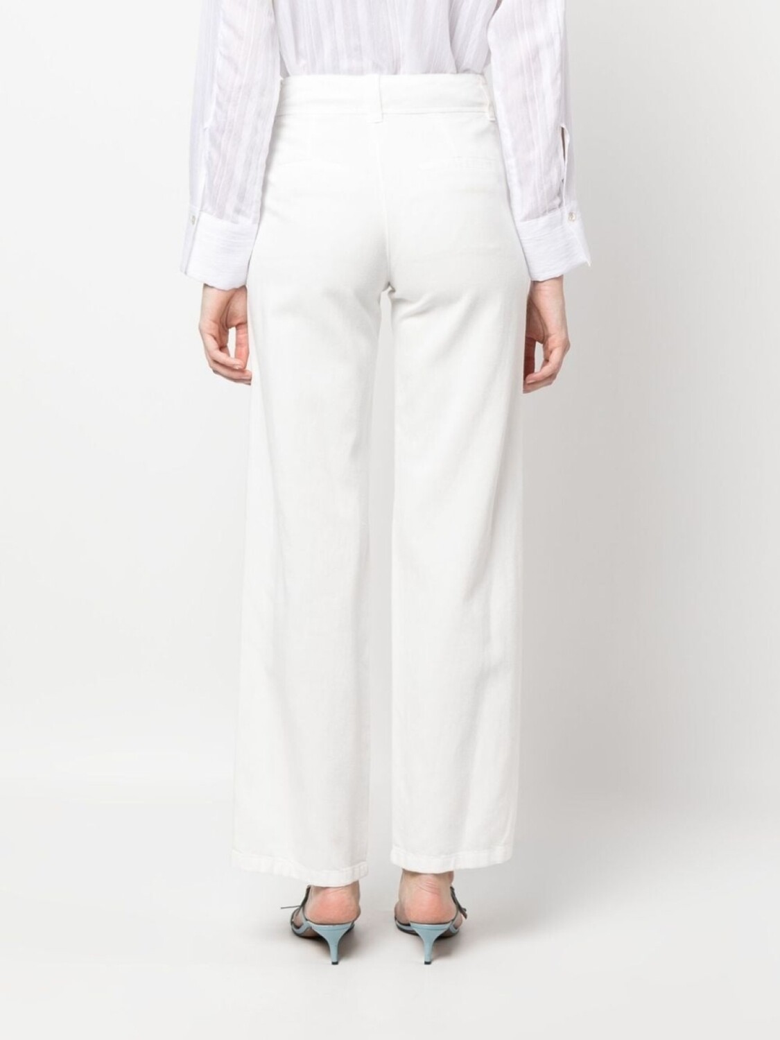 Белый, смесовый хлопок, петли для ремня, потайная застежка спереди, два кармана по бокам, два кармана с листочкой сзади, завышенная талия и прямой крой.
