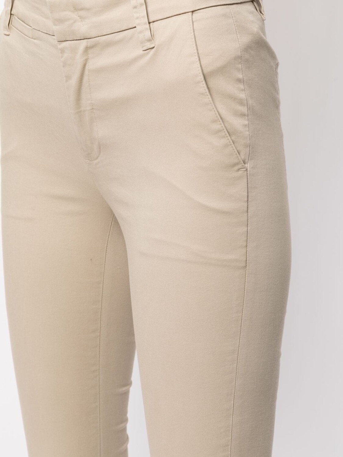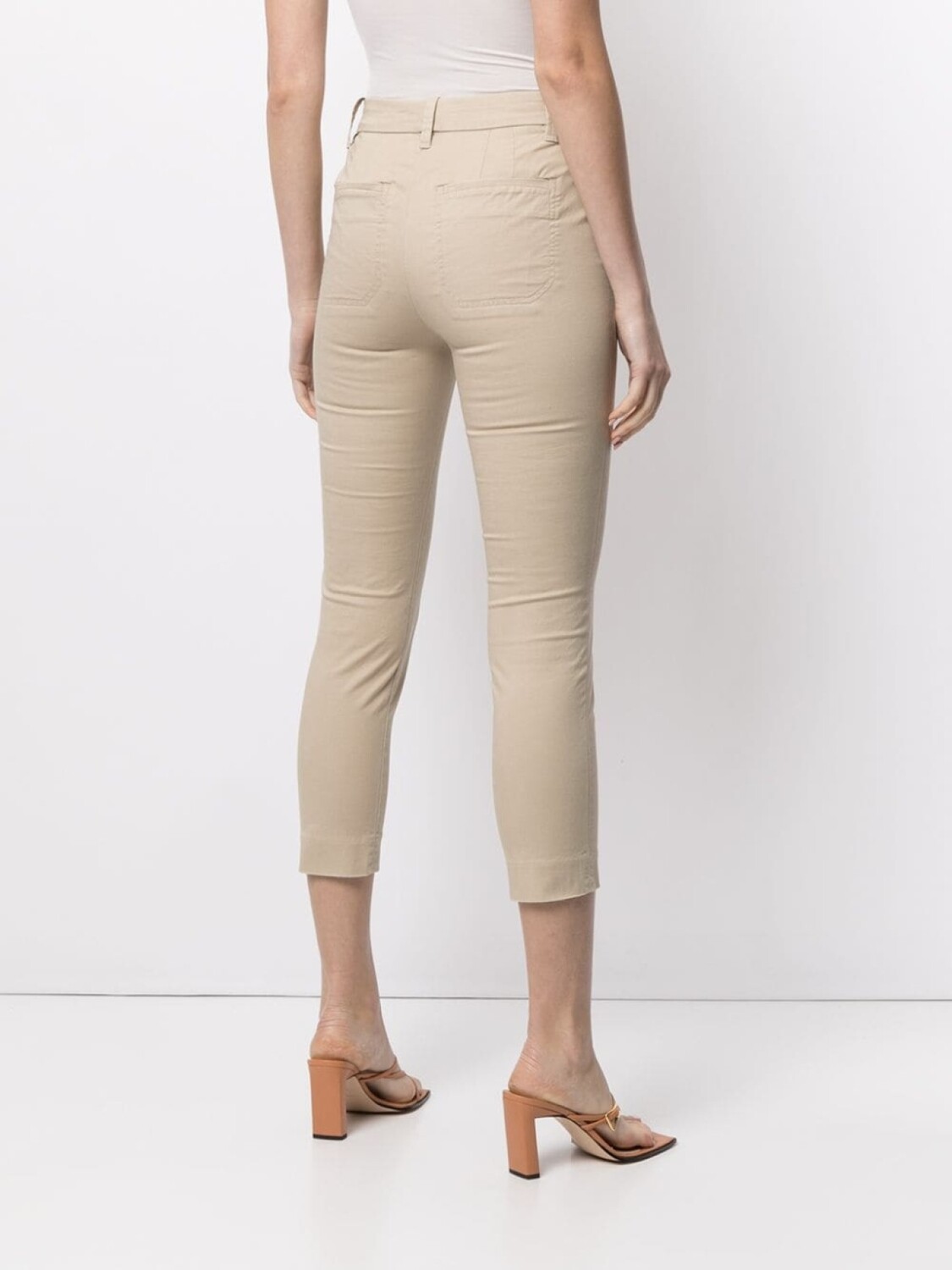 Средняя посадка, петли для ремня, застежка на молнии и пуговице спереди, два накладных кармана сзади и укороченная длина.