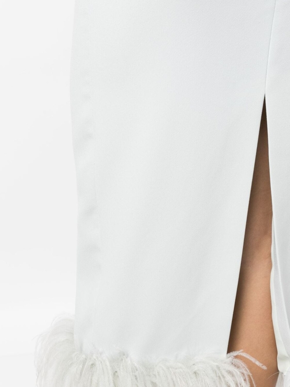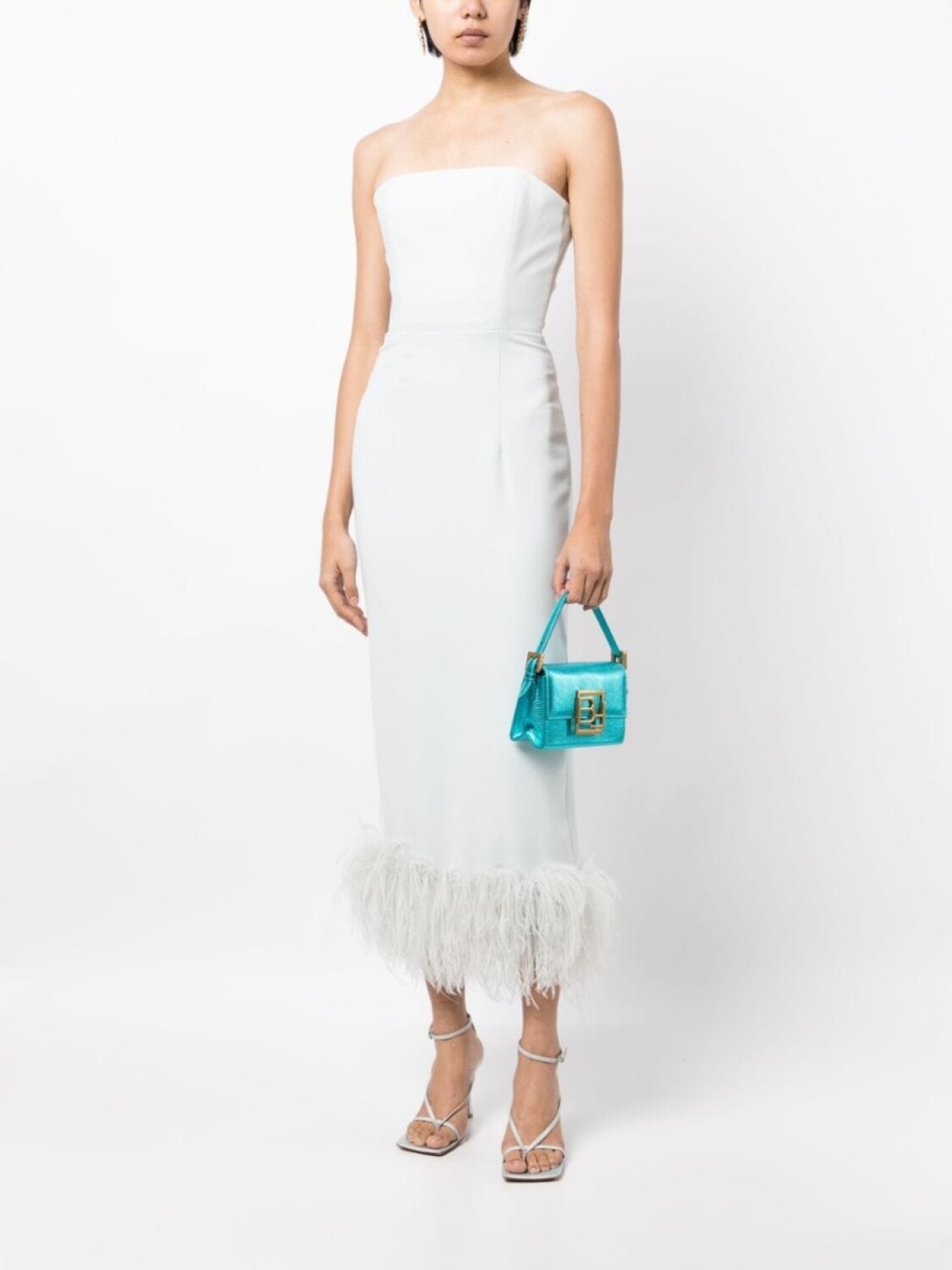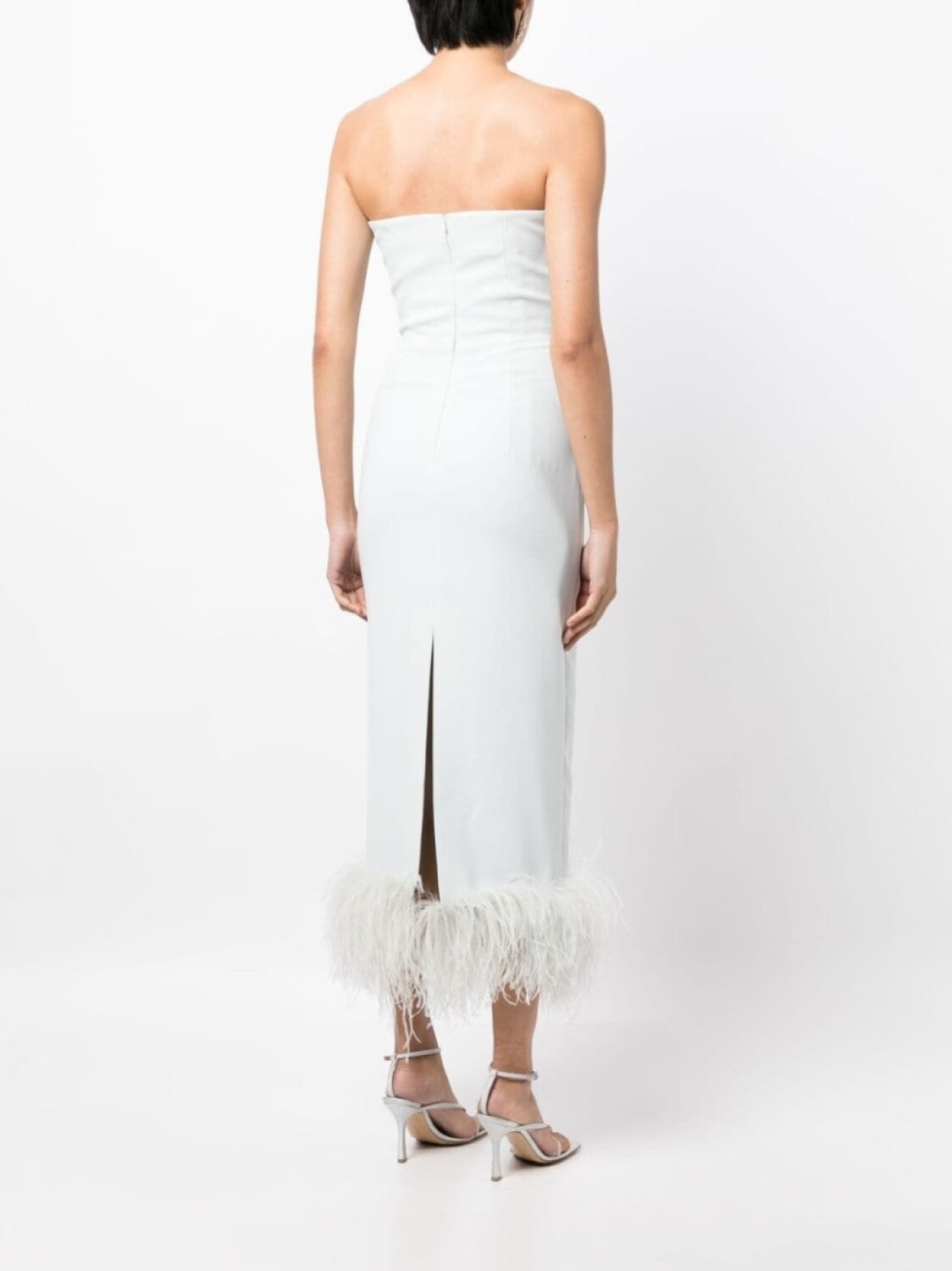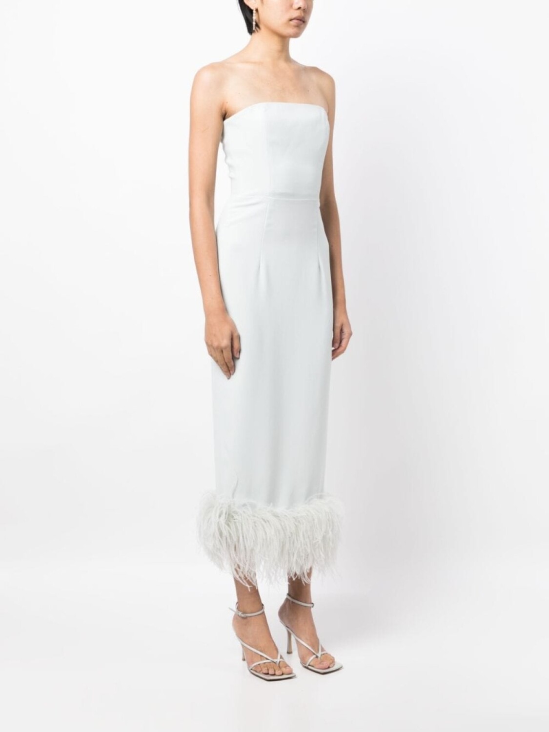 Серо-зеленый, страусиные перья, креповая текстура, без бретелей, потайная застежка на молнии сзади, вырез сзади, отделка перьями и длина миди.