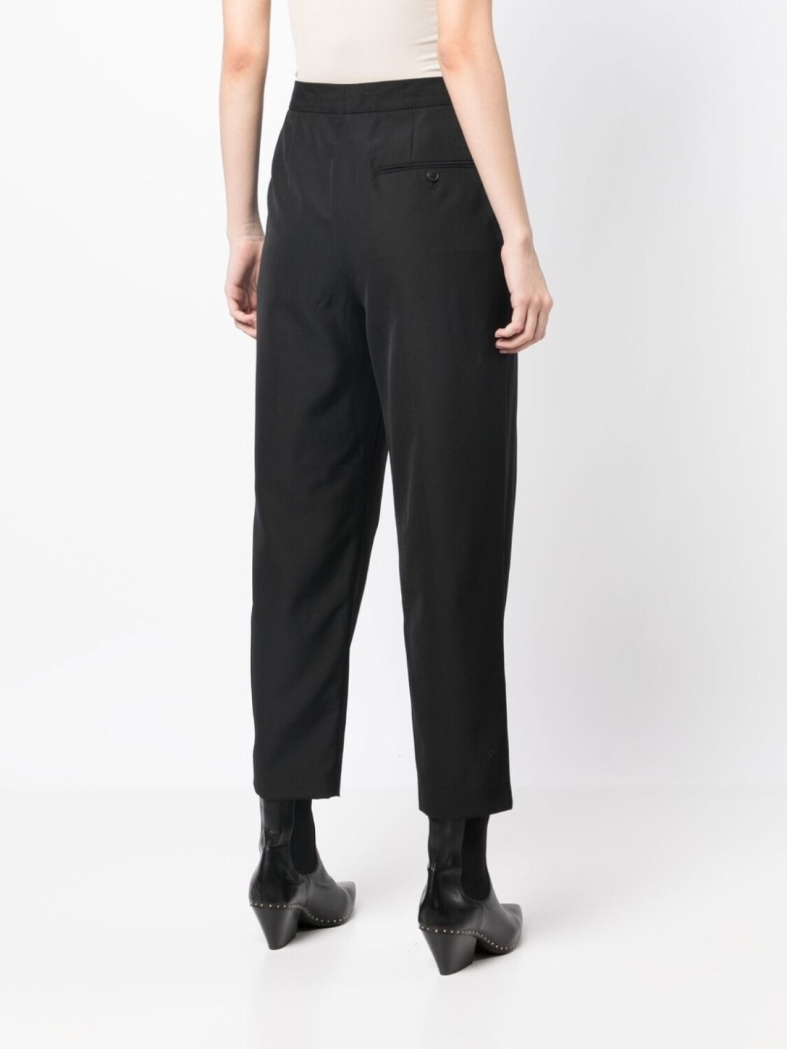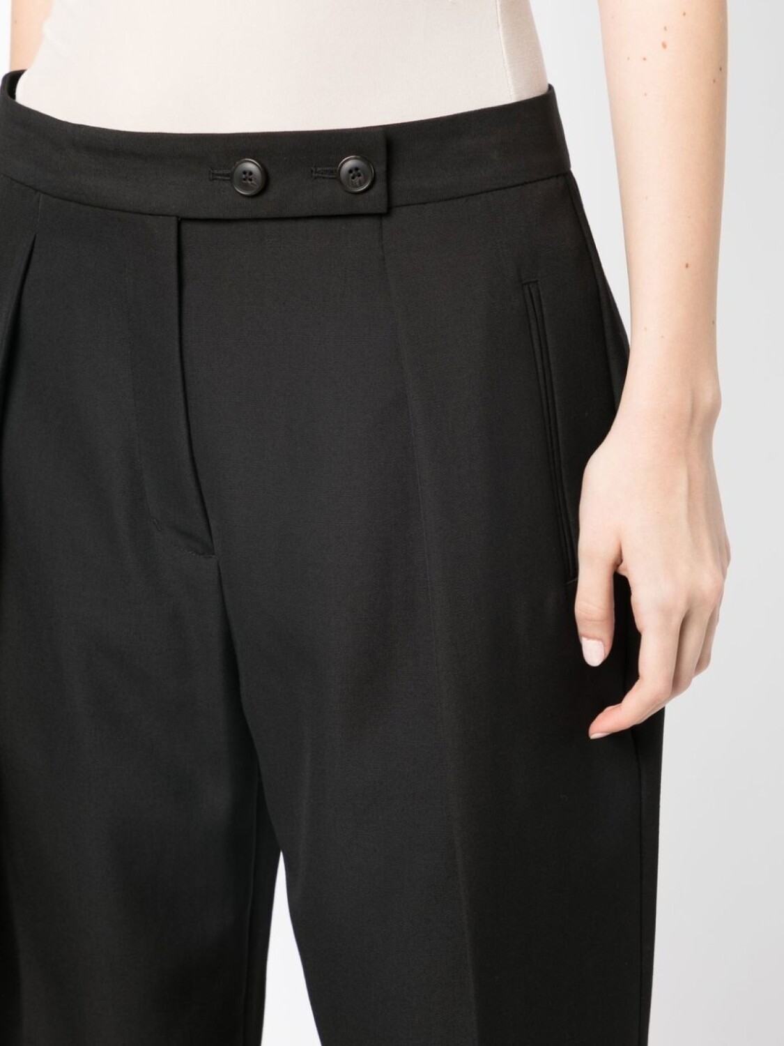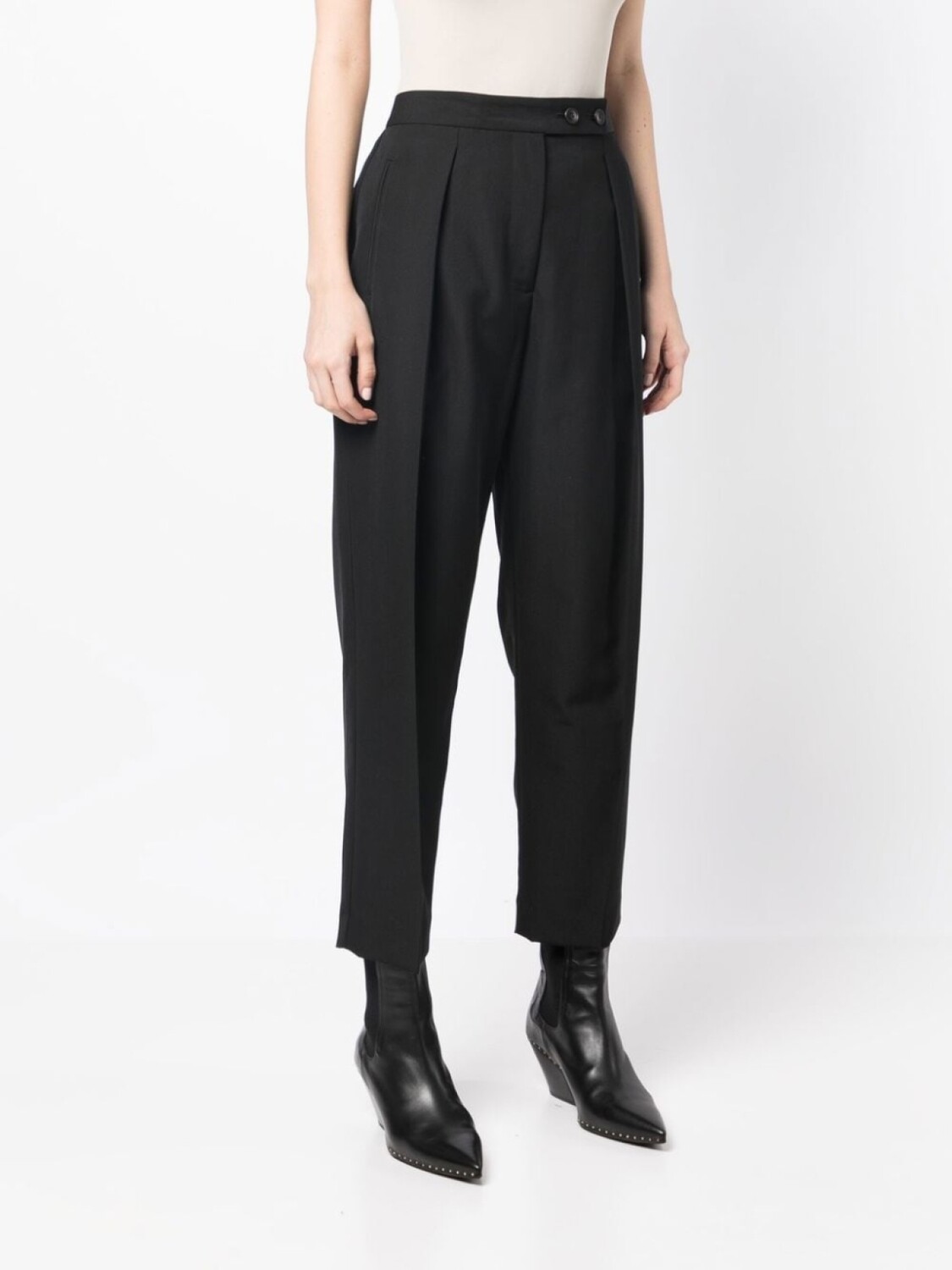 Черный, смесь шерсти и хлопка, завышенная талия, ширинка на пуговицах, узор в вертикальную полоску, складки, укороченная длина и зауженный крой.