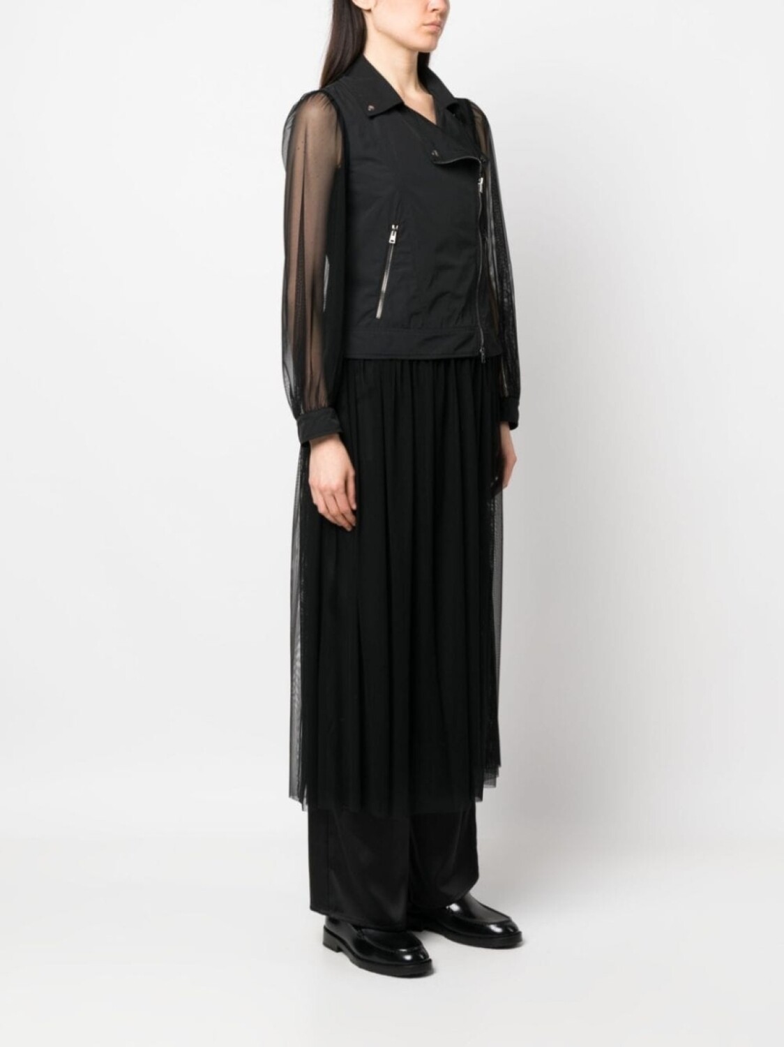 Черный, косой воротник, сетчатый тюль, смещенная застежка на молнии спереди, длинные прозрачные рукава и два кармана на молнии по бокам.