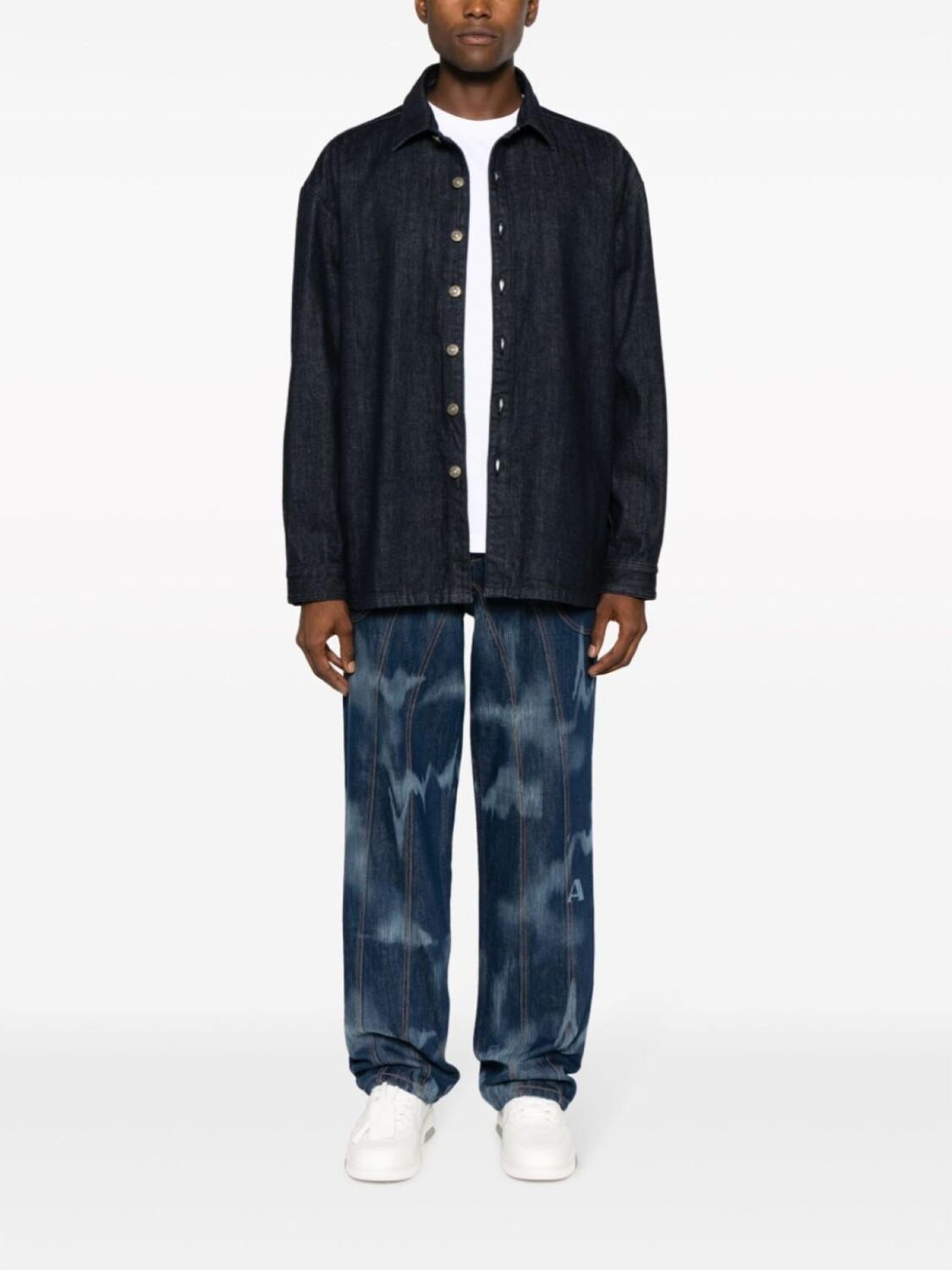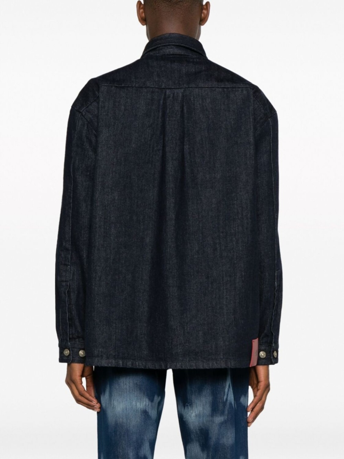 Индиго, хлопок, темный оттенок денима, деним, нашивка с логотипом сзади, классический воротник, застежка на пуговицах спереди, длинные рукава, манжеты на пуговицах и прямой подол.