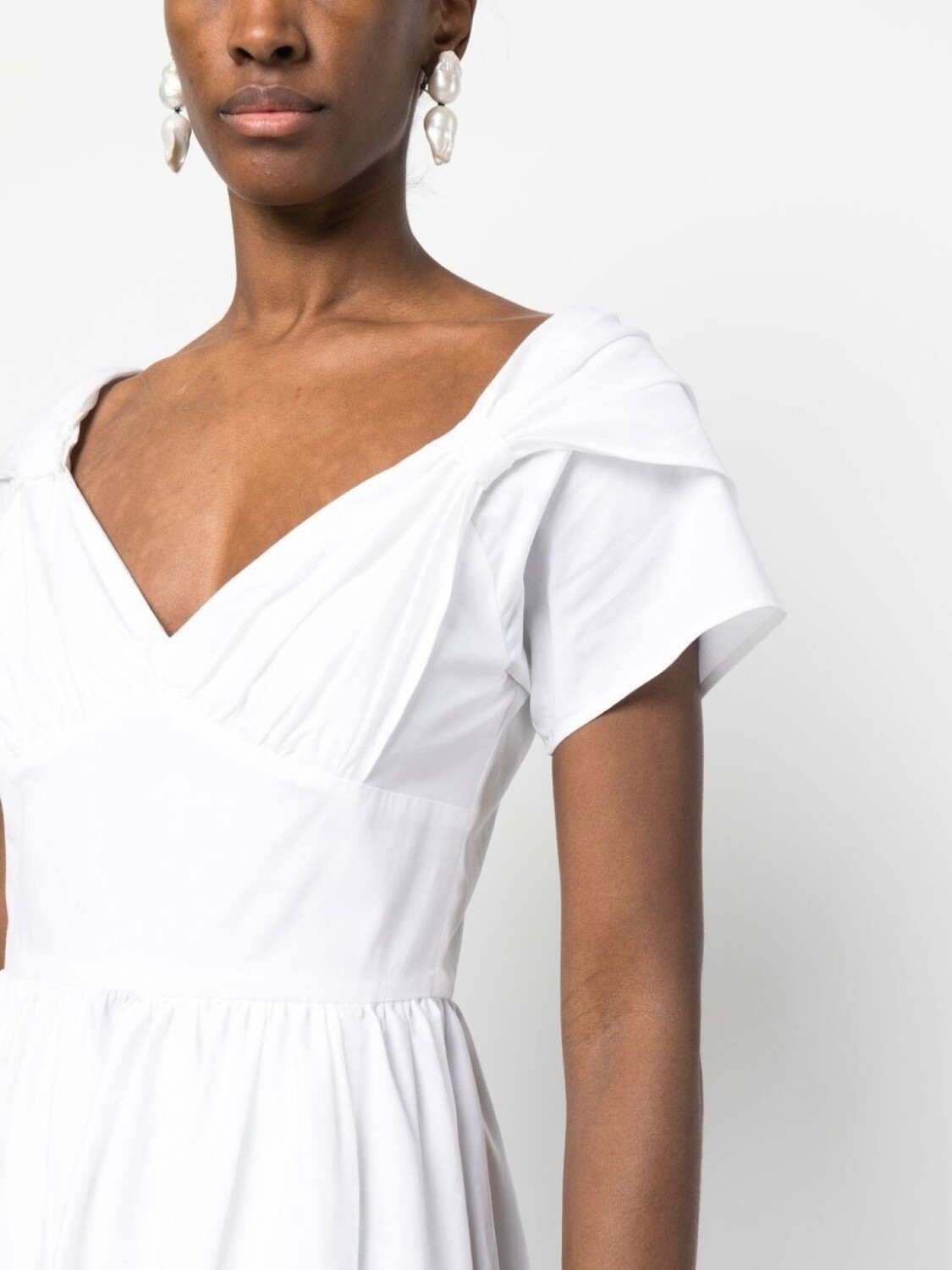 Белый, стрейчевый органический хлопок, детали с оборками, вырез в форме сердца, верхний слой с короткими рукавами, застежка на молнии сзади, расклешенная юбка и длина до середины икры. Ответственный выбор: