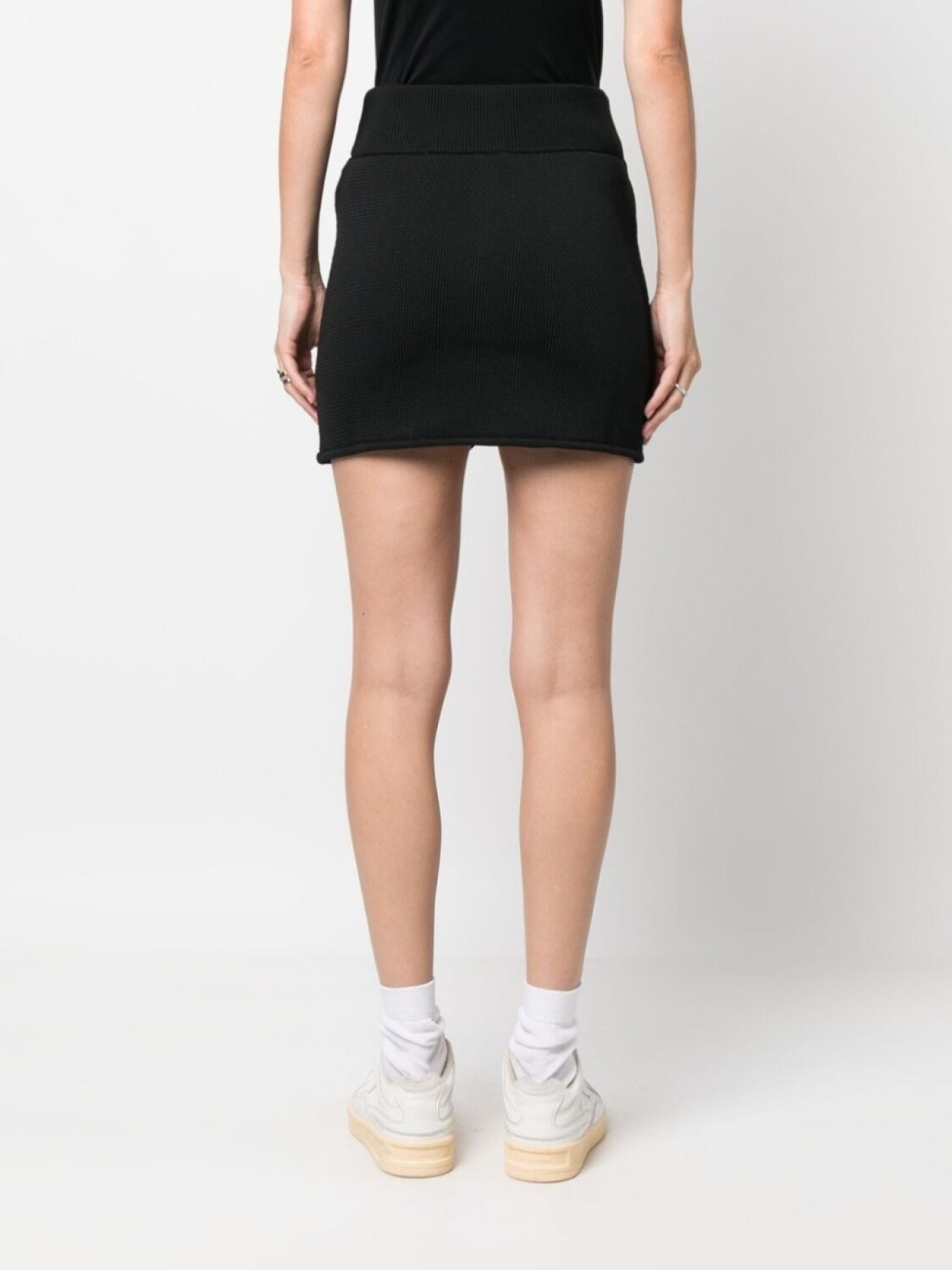 Черный, трикотаж в рубчик, застежка на молнии спереди, эластичный пояс, длина до бедер и прямой подол.