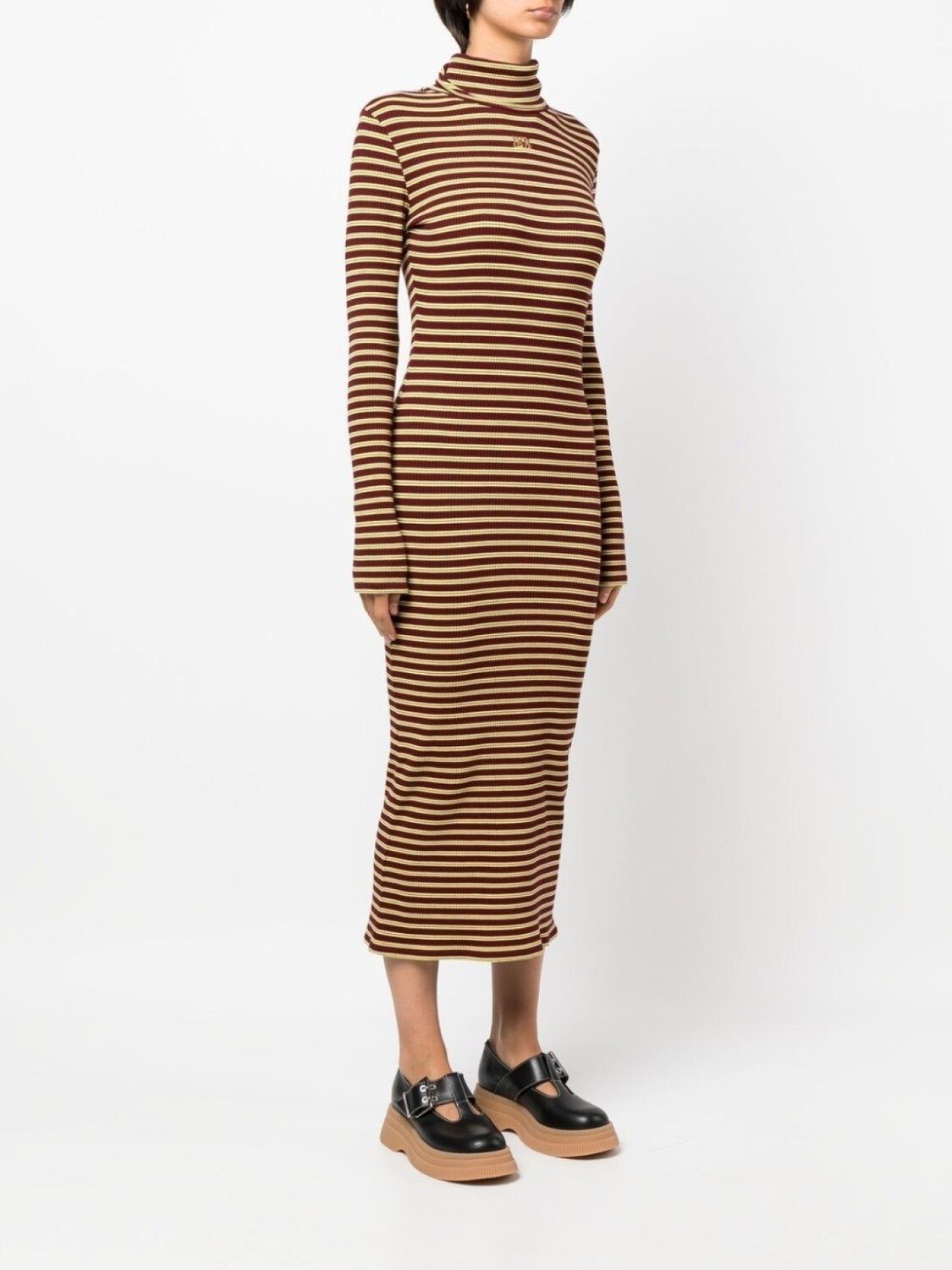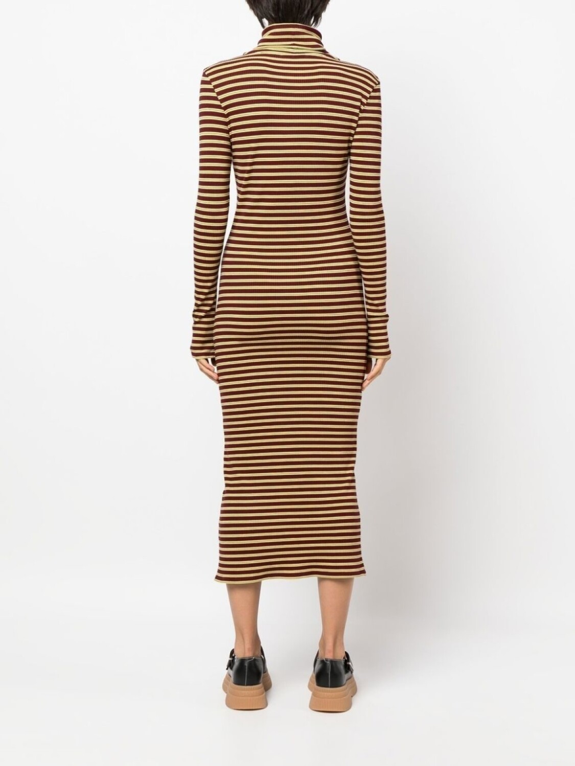 Винно-красный, темно-желтый, тонкая вязка, узор в горизонтальную полоску, высокий воротник, длинные рукава и длина макси.