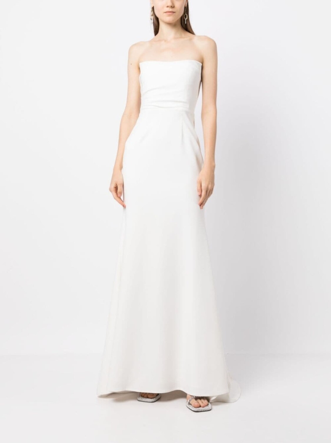Цвет слоновой кости, без бретелей, расклешенный крой, драпировка, потайная застежка на молнии сзади и длина макси.